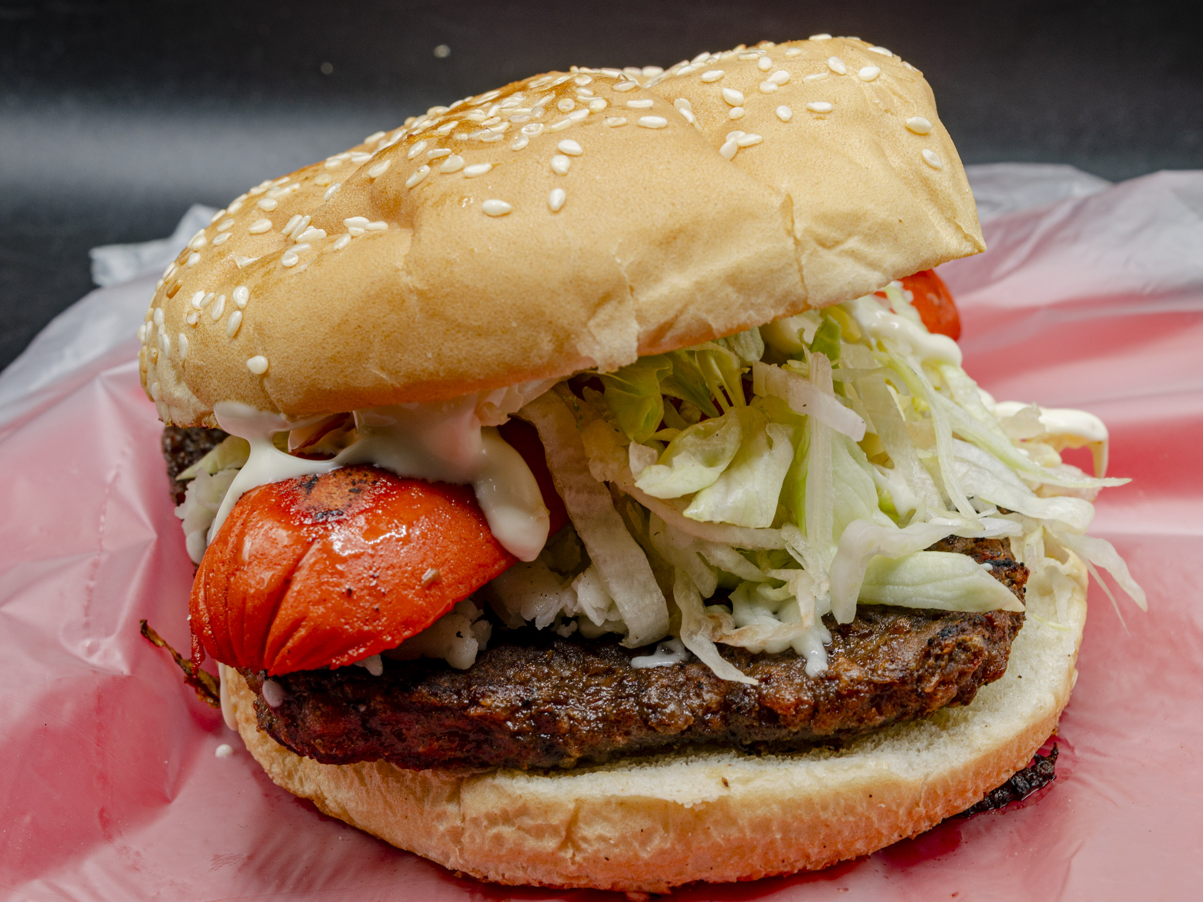Hamburguesa al Carbón. Carne sirloin, bistec, queso blanco, salchicha, mostaza, cátsup, mayonesa, lechuga, pepinillos y cebolla.