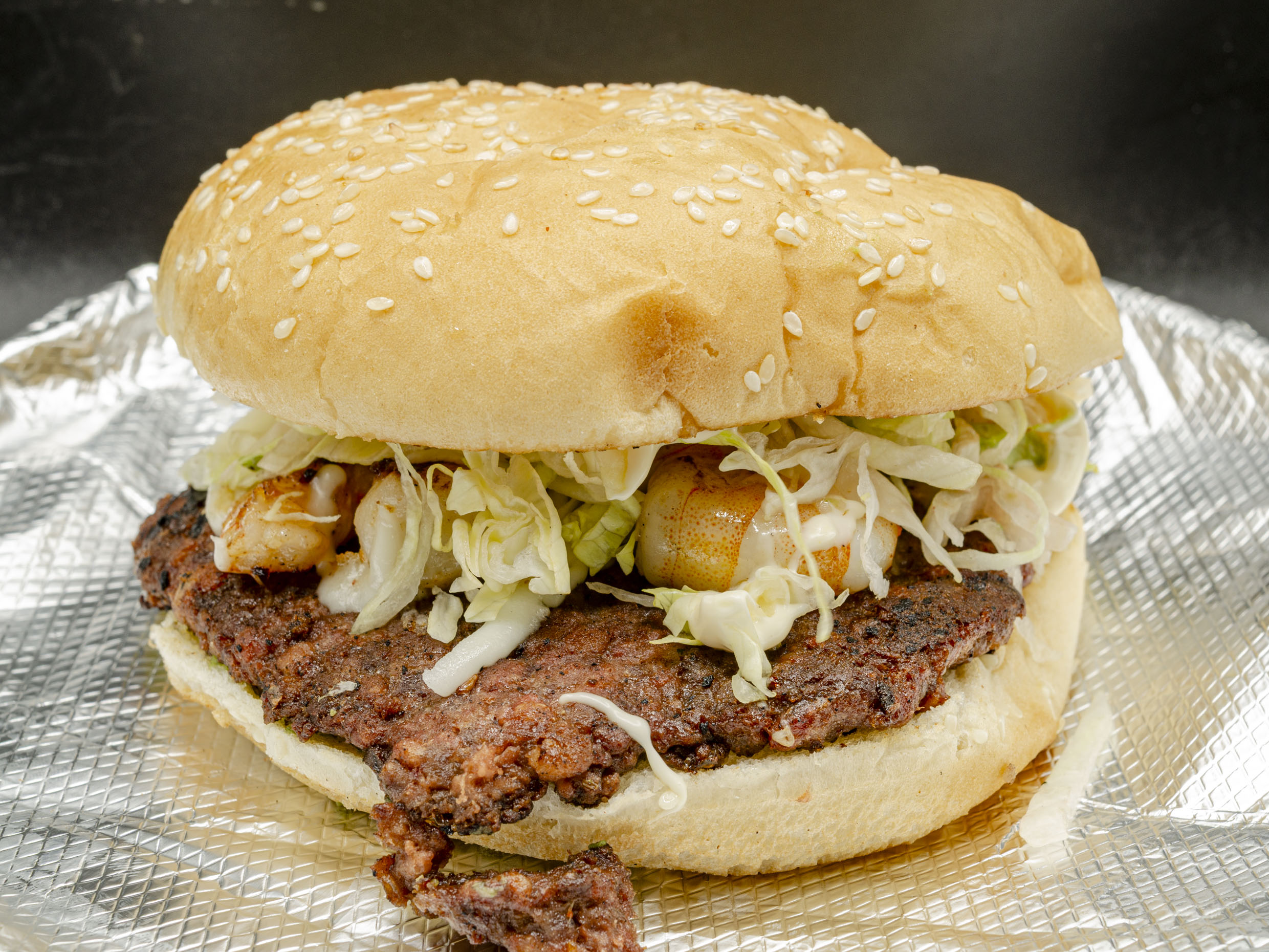 Hamburguesa al Carbón. Carne sirloin (140gr), camarones, queso blanco, mayonesa, aguacate, lechuga y cebolla.
