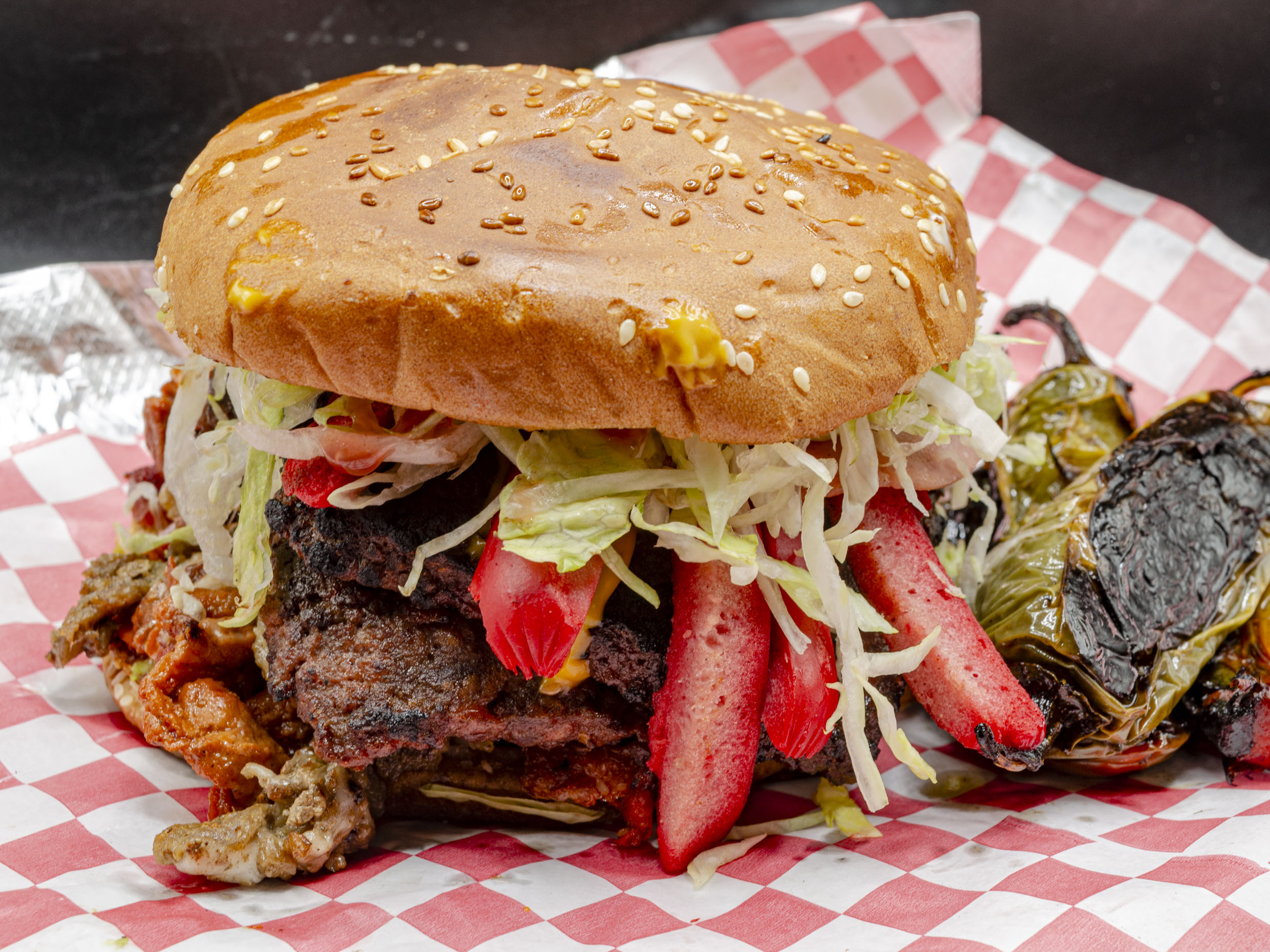 Hamburguesa al Carbón. Carne de sirloin, jamón, salchicha, Queso amarillo, mostaza, mayonesa, lechuga, aguacate, pepinillos y cebolla.