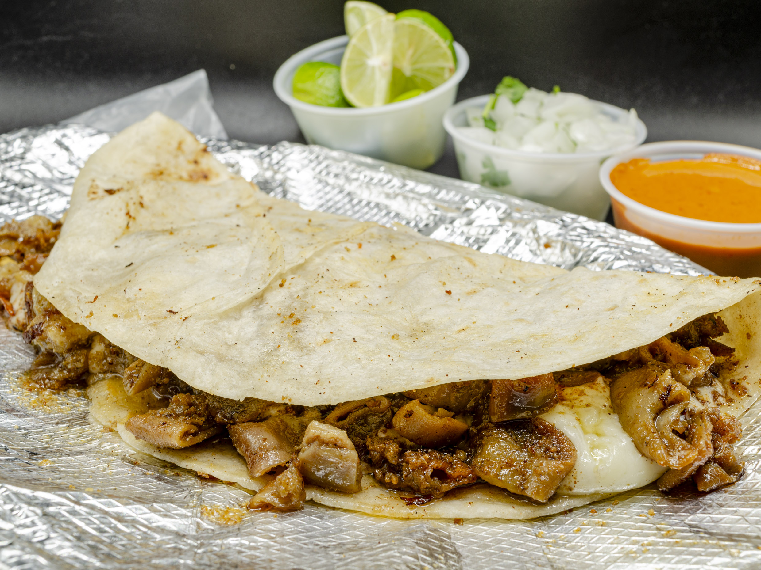 Quesadilla en tortilla de harina con pastor. Incluye salsa de cacahuate, salsa verde, cilantro, cebolla, rábanos, pepinos y limón.