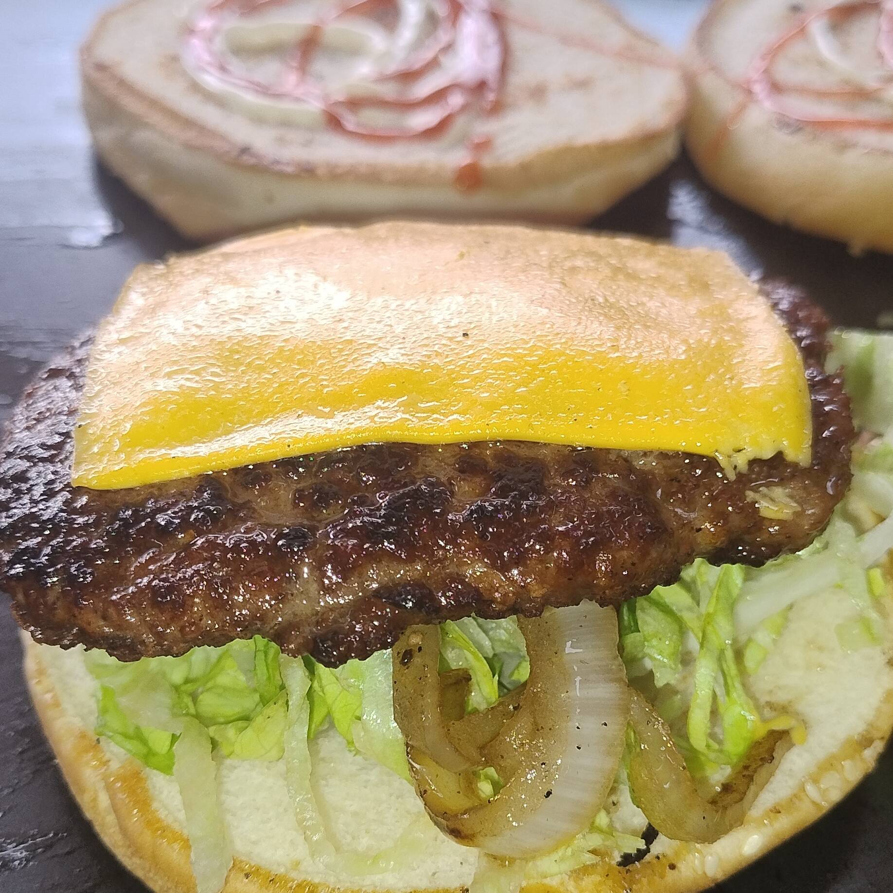Hamburguesa al Carbón. Carne de Sirloin, Queso amarillo, mostaza, mayonesa, lechuga, pepinillos y cebolla.