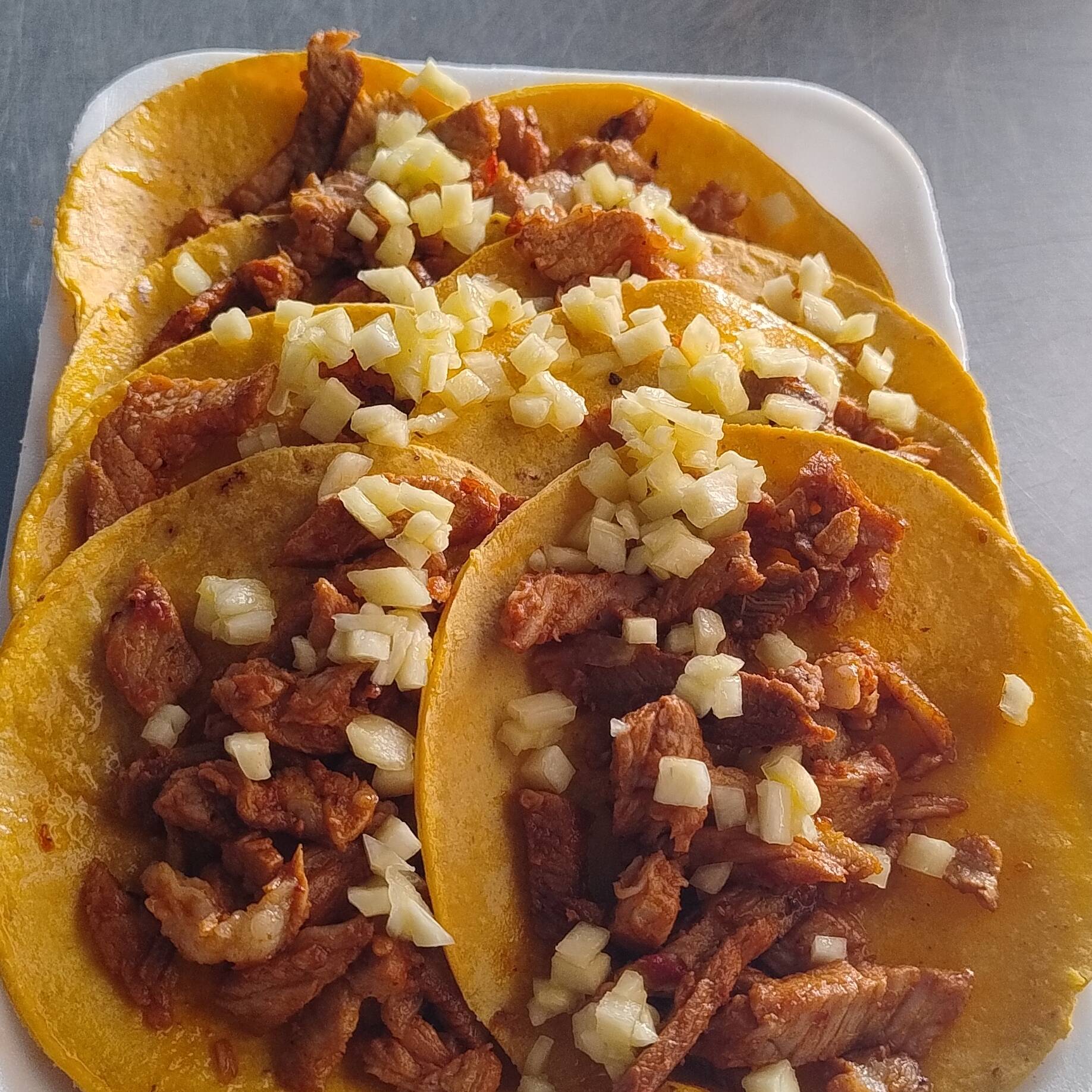Pastor con queso blanco gratinado, cebolla, chile morrón, 13 tortillas.