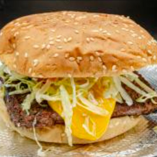 Hamburguesa al Carbón. Carne de Sirloin, Queso amarillo, mostaza, mayonesa, lechuga, pepinillos y cebolla.