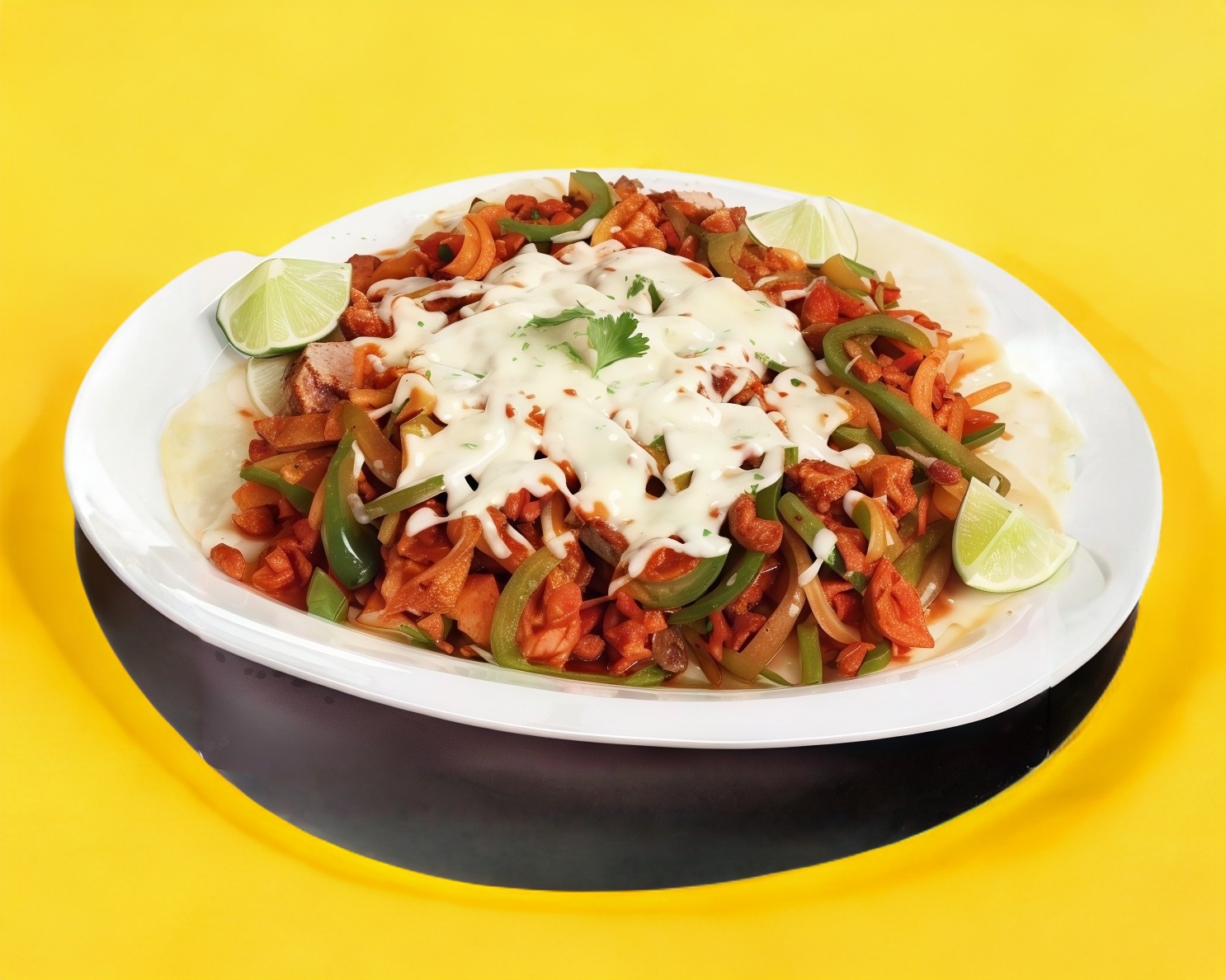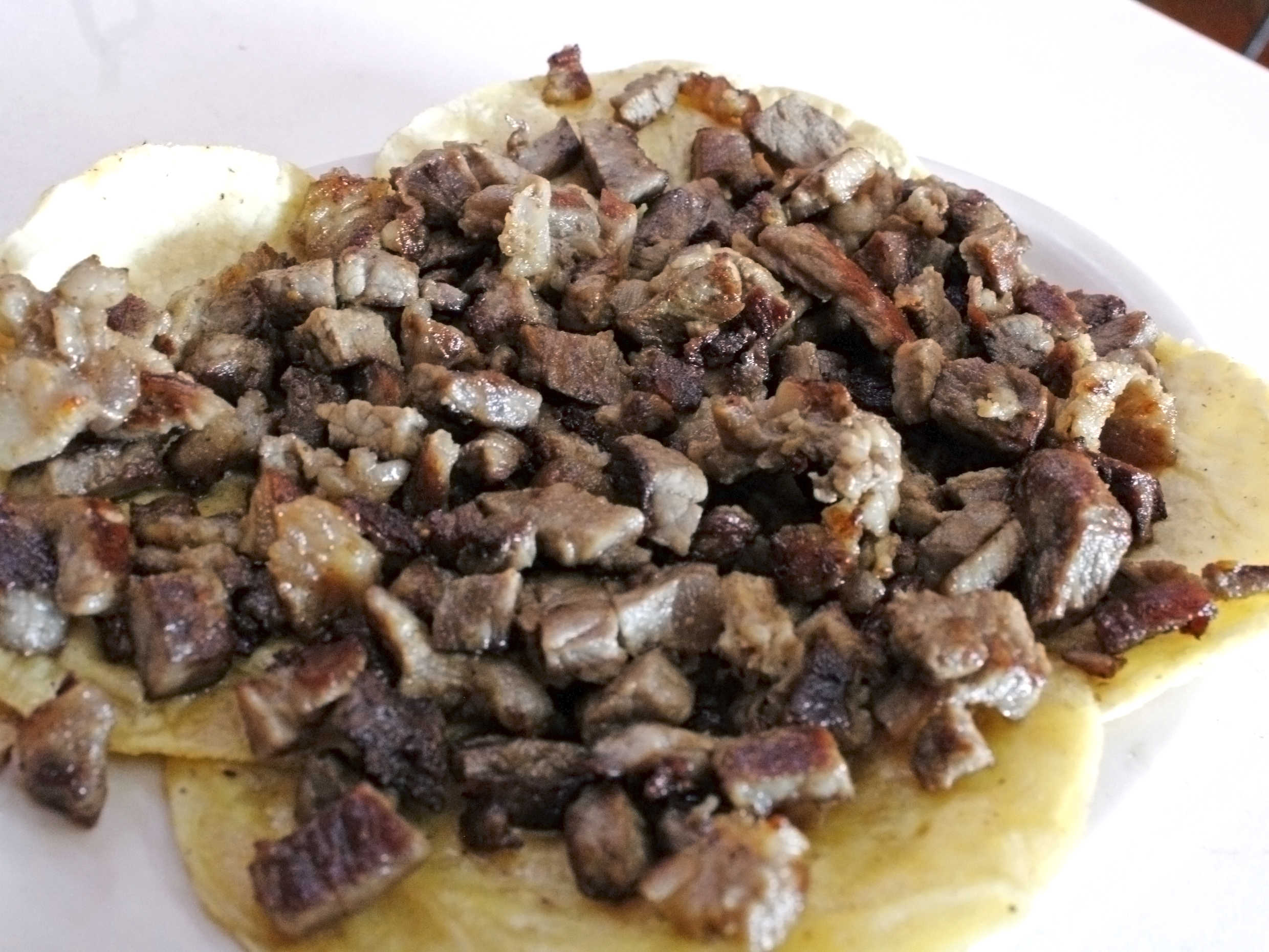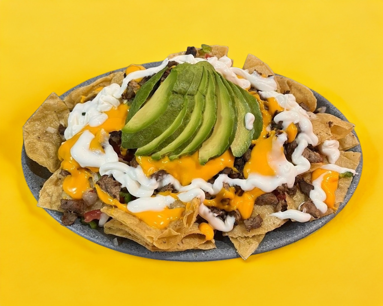 Totopos,110g de carne ,queso,crema,aguacate,y pico de gallo(cebolla,tomate y chile)
