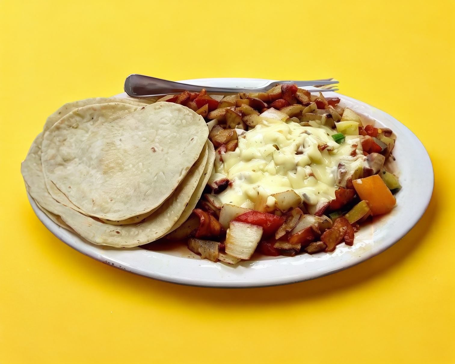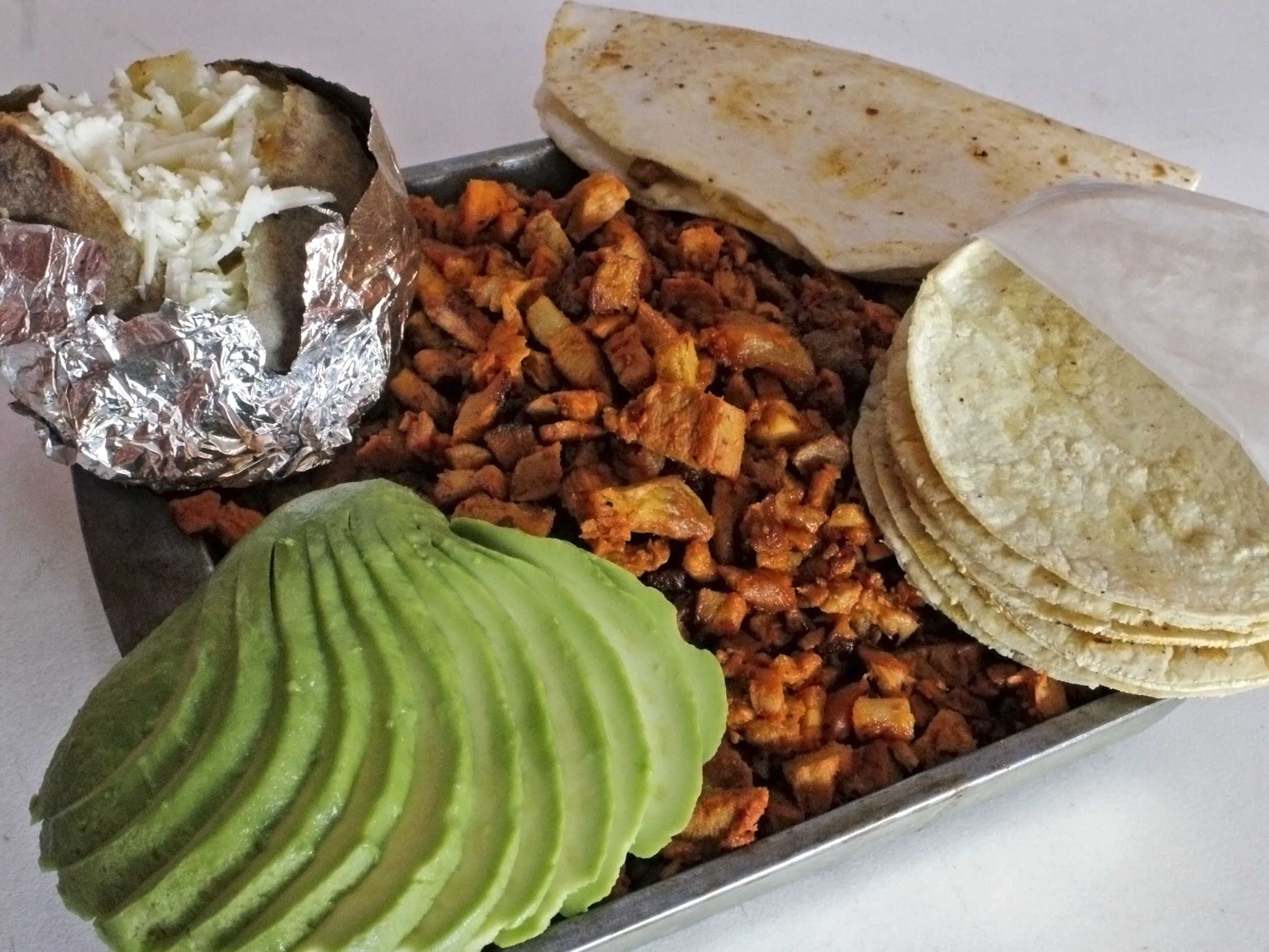 Carne, tortillas, 1 aguacate, 4 papas asadas o 4 quesadillas salsas y verduras