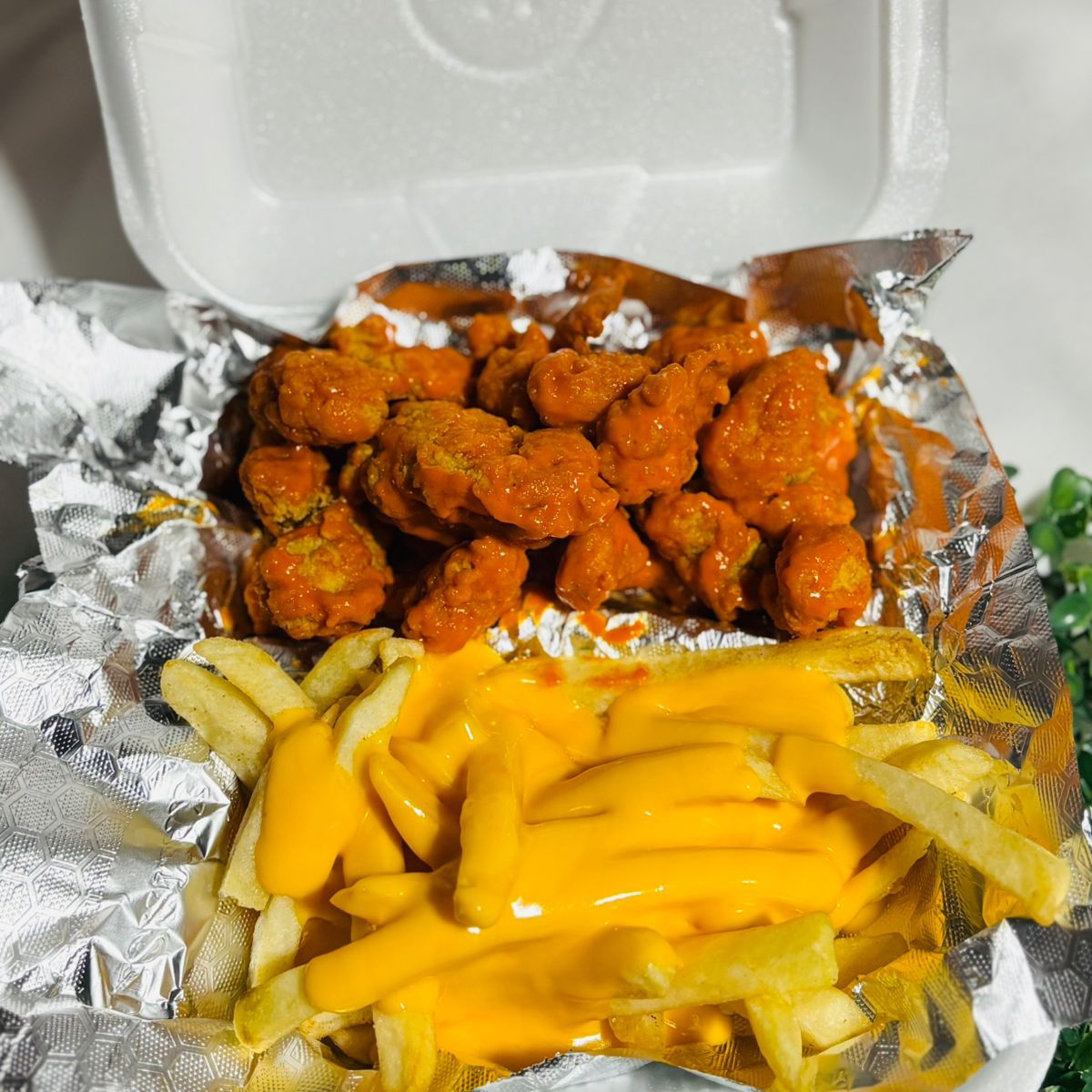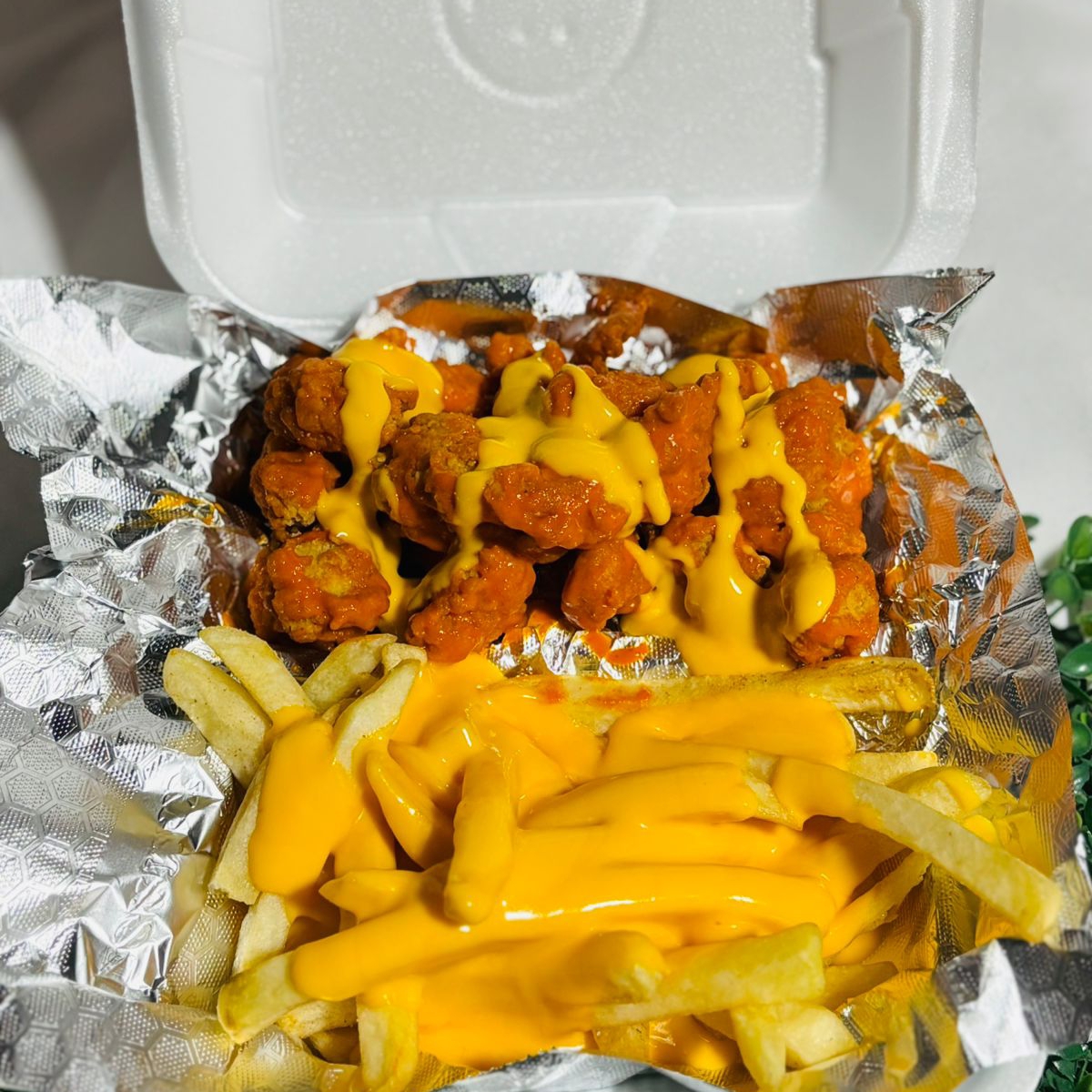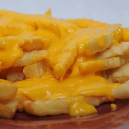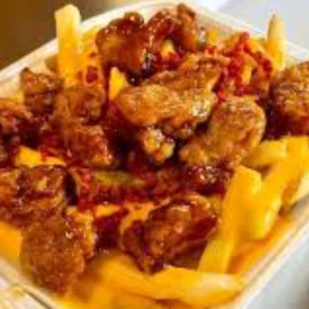 Papas 300g con boneless 300g bañados con queso amarillo y salsa bufalo