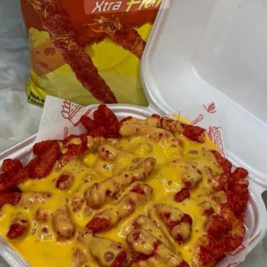 Cheetos flamin hot bañados con queso amarillo