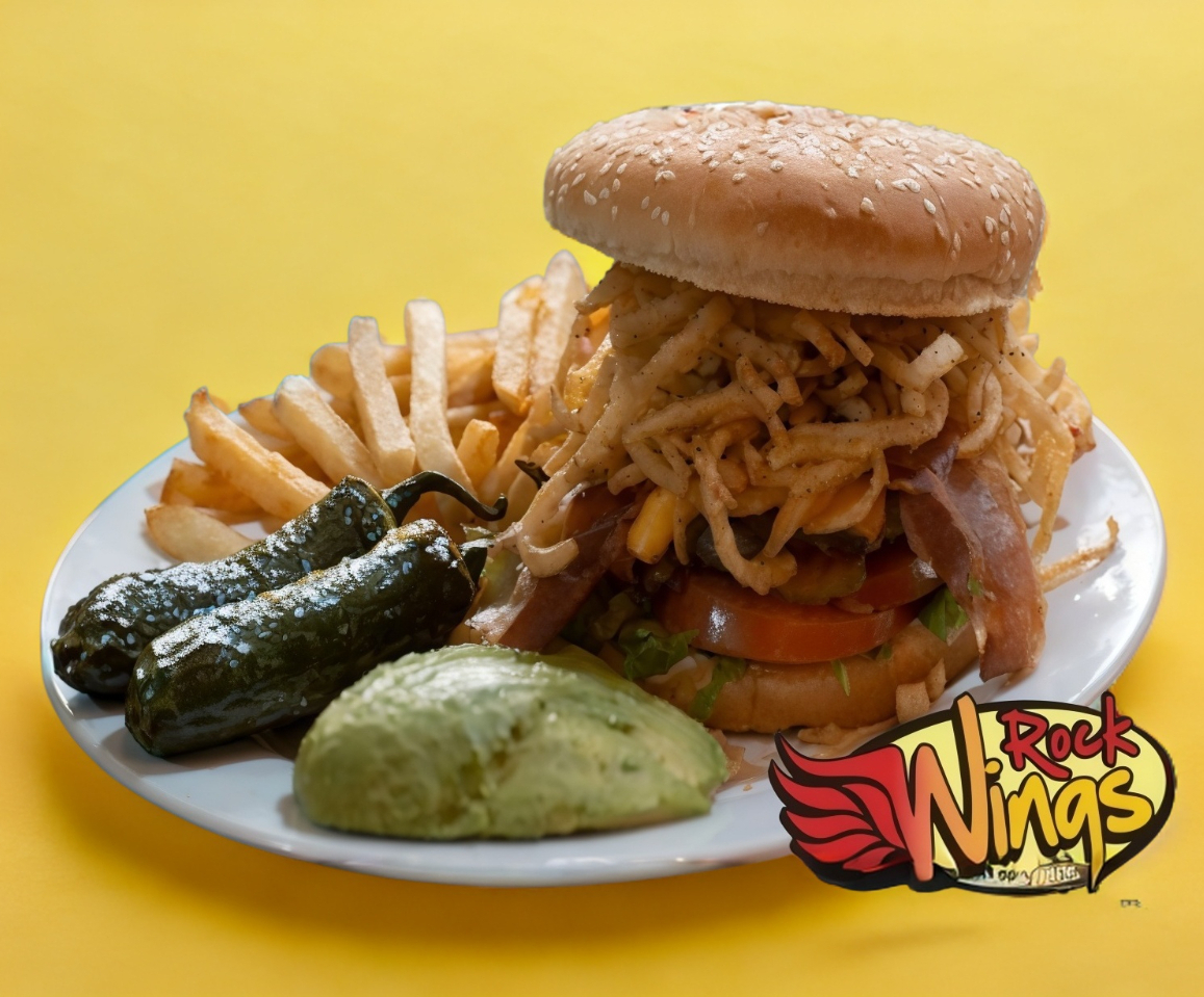 Deliciosa hamburguesa de carne con queso, tocino y las infaltables greñas de cebolla.