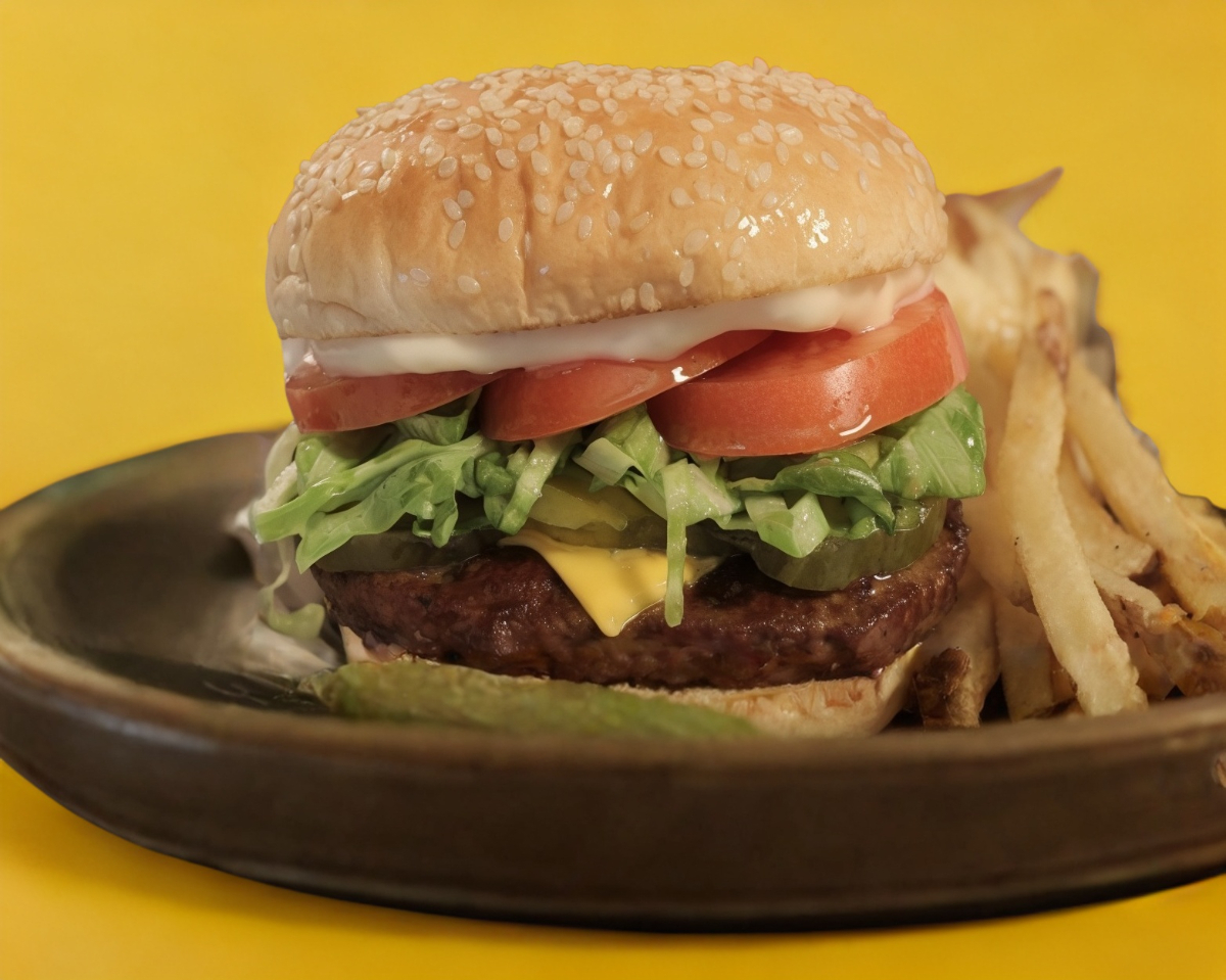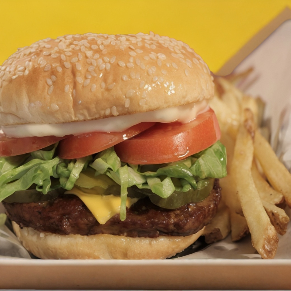 Deliciosa hamburguesa de carne con queso, mayonesa, lechuga, tomate y pepinillos.