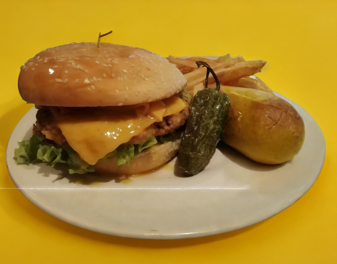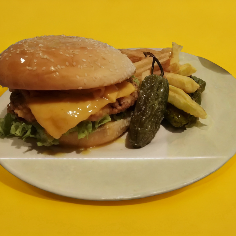 Deliciosa hamburguesa de pollo a la plancha con queso, lechuga, tomate y pepinillos.