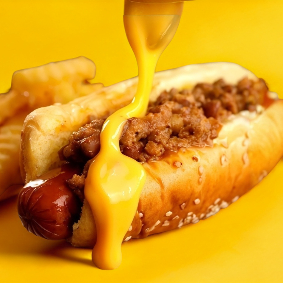 Hot dog grande con salchicha de res, viene con mayonesa, tomate, cebolla y pepinillos y queso amarillo