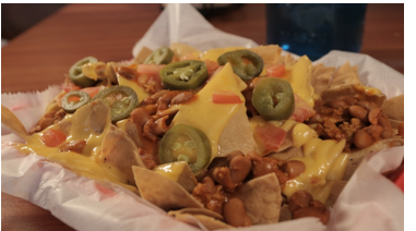 Deliciosos totopos fritos hechos en casa. Combinados con una mezcla de 2 quesos, chilli beans, tomate picado y chile jalapeño.