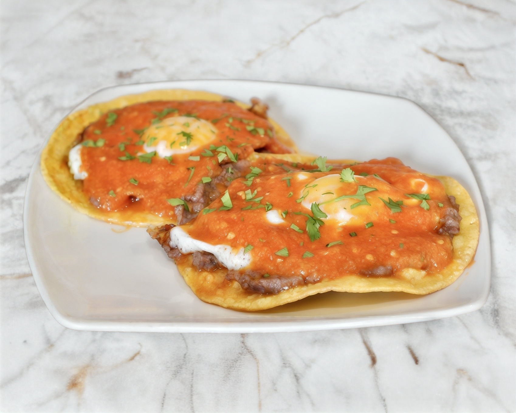 Tenemos en salsa roja. Agregamos 2 huevos por $10.00