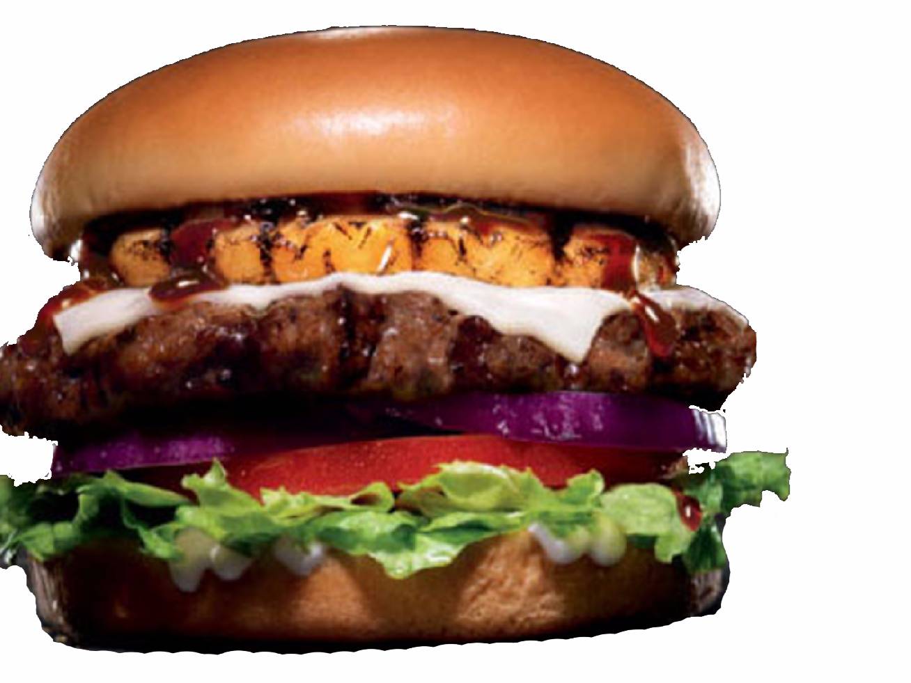 HAMBURGUESA HECHA CON CARNE TOP SIRLOIN PIÑA Y SALSA TERIYAKI , QUESO AMERICANO, LECHUGA ROMANA, CEBOLLA MORADA, TOMATE, PEPINILLOS, CATSUP, MAYONESA, MOSTAZA Y PAN SIN AJONJOLI