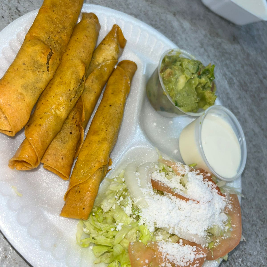 CONTIENE 4 FLAUTAS, CREMA, GUACAMOLE, LECHUGA TOMATE Y CEBOLLA