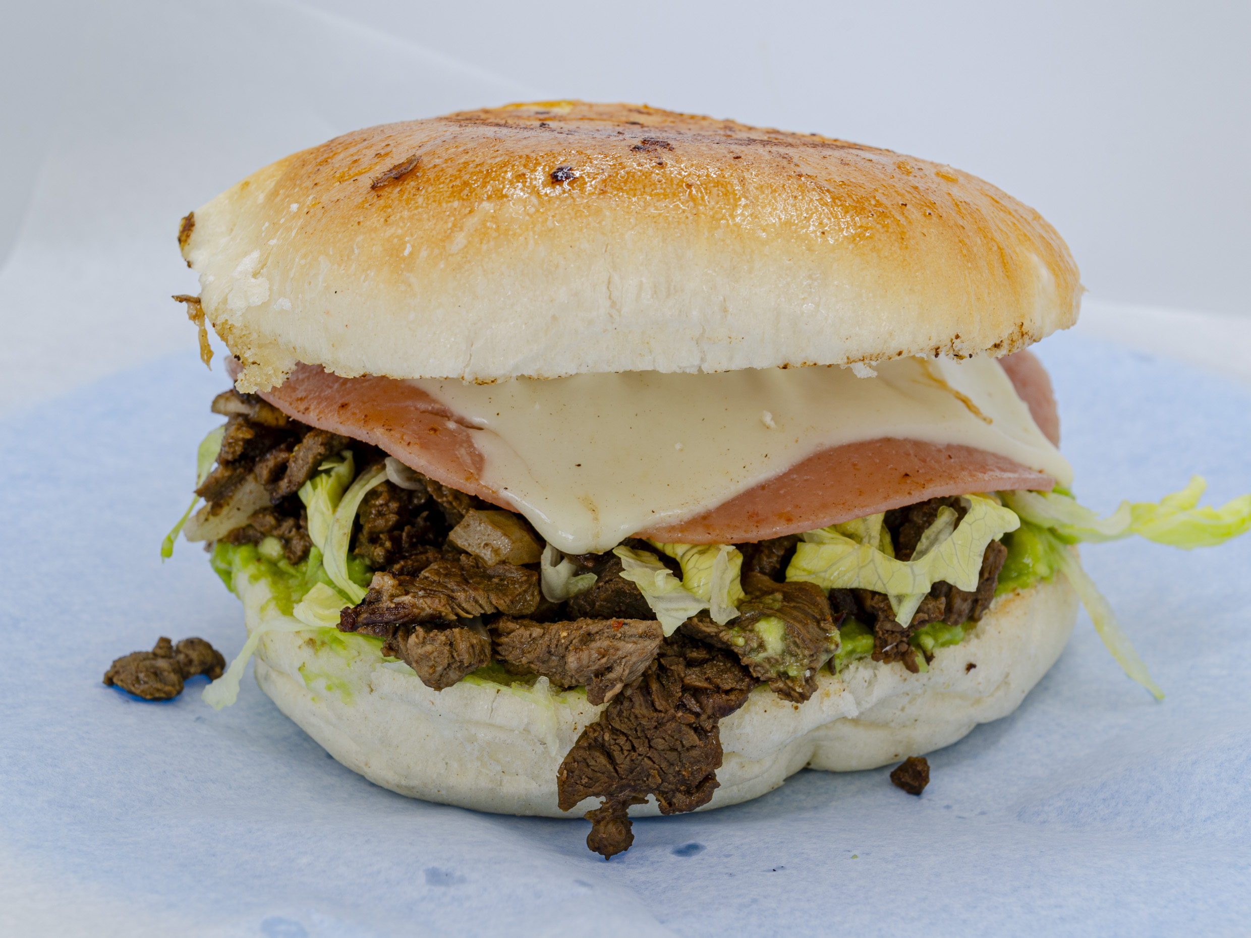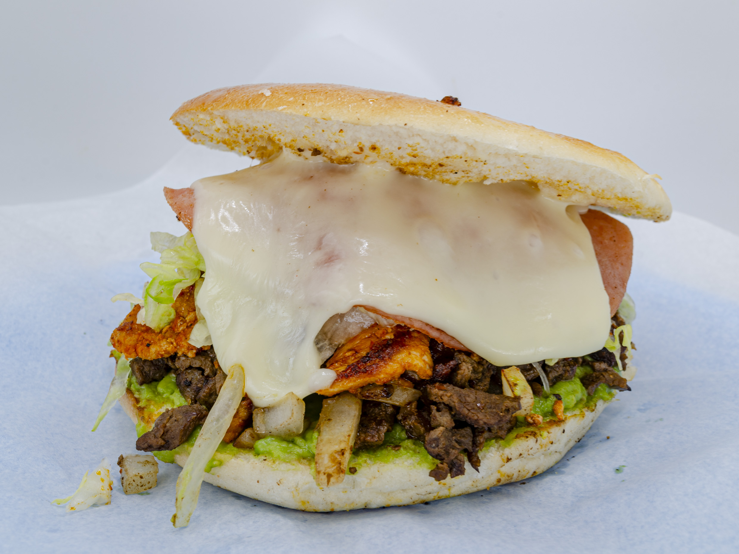 Bistec, colita, jamón, queso, aguacate, lechuga y tomate