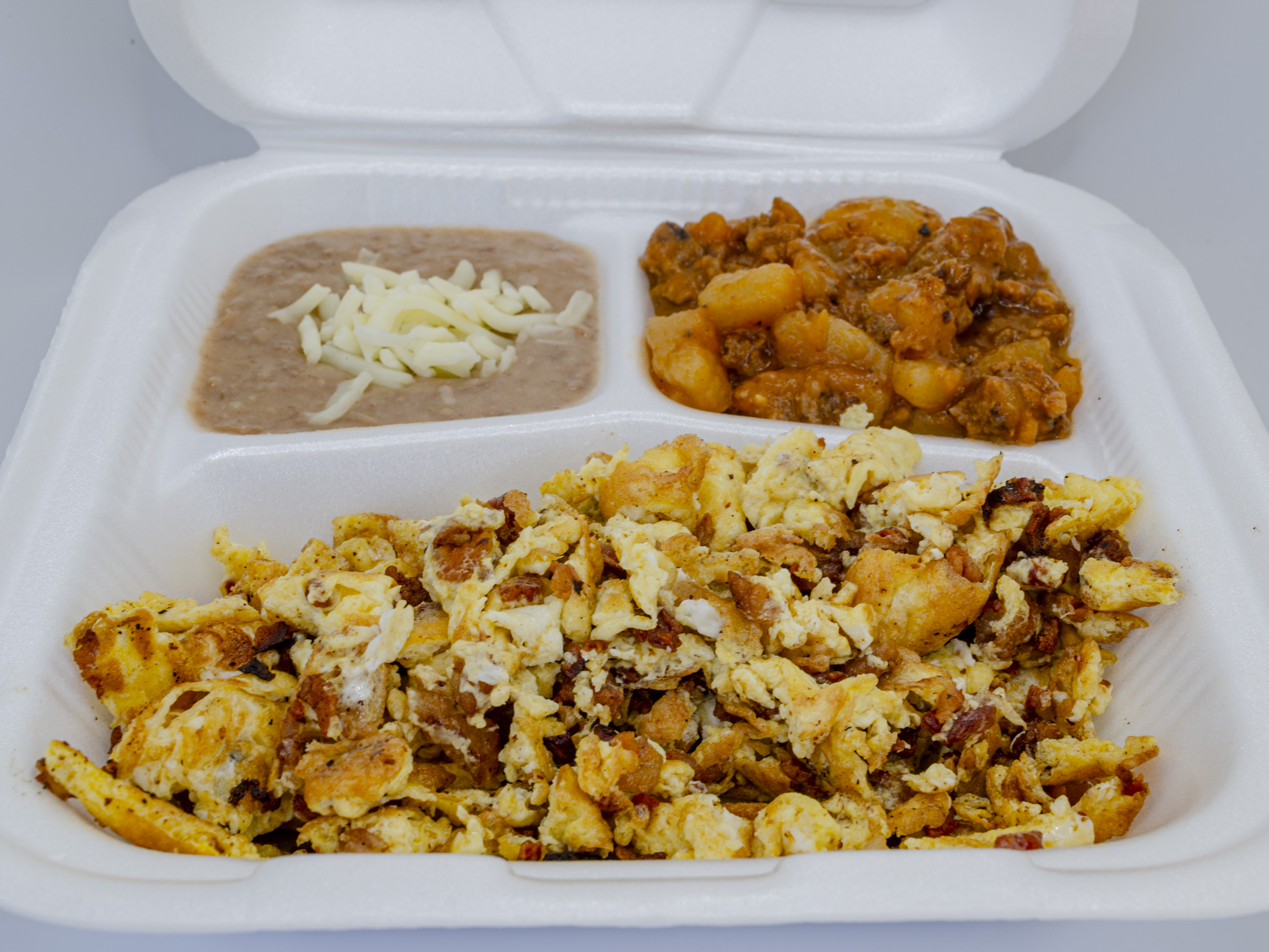 Montados con 2 huevos (estrellados o revueltos), guisado y frijoles.