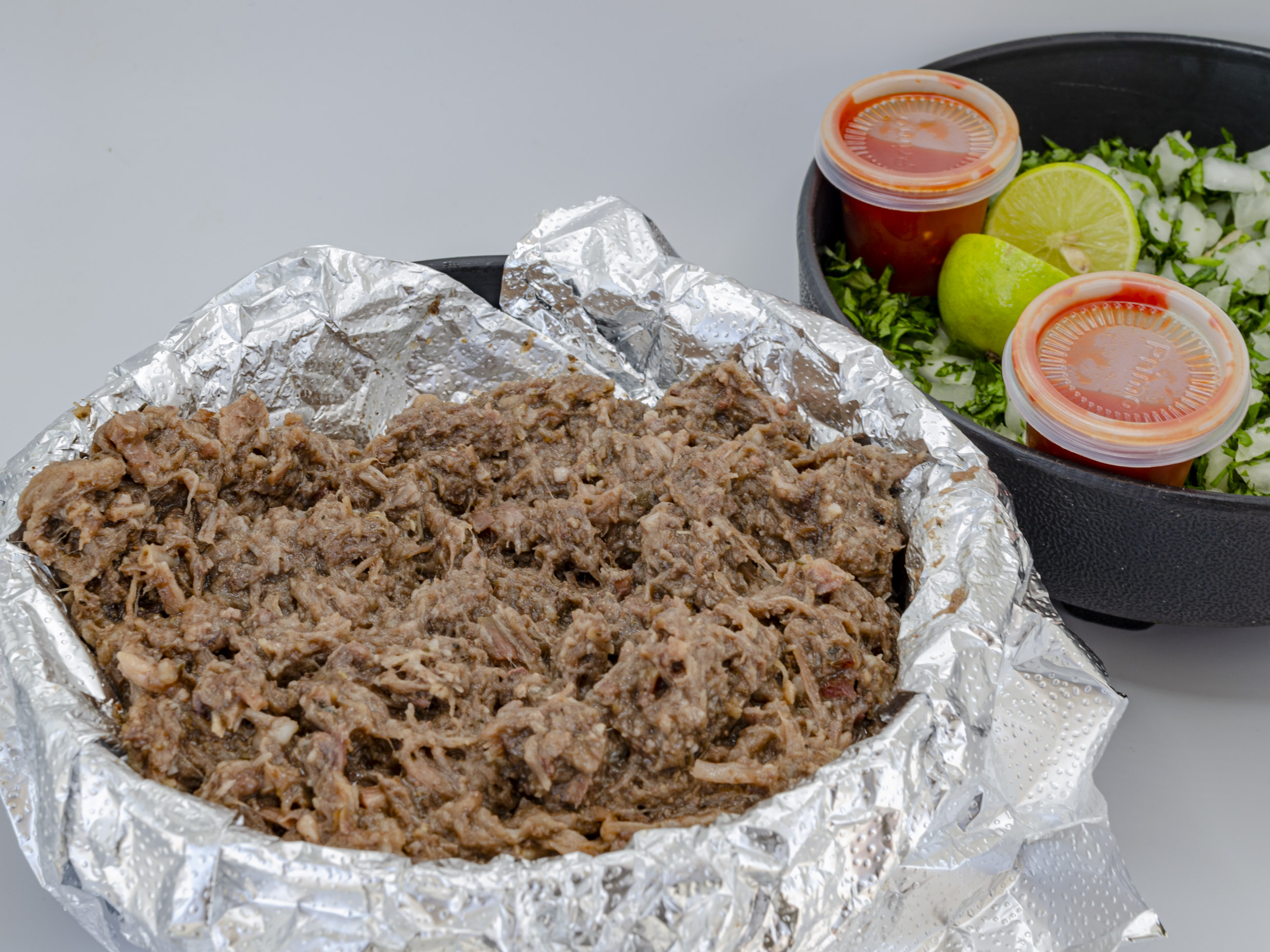 1 kg de Barbacoa, cebolla, cilantro, limones, tortillas y salsa roja.