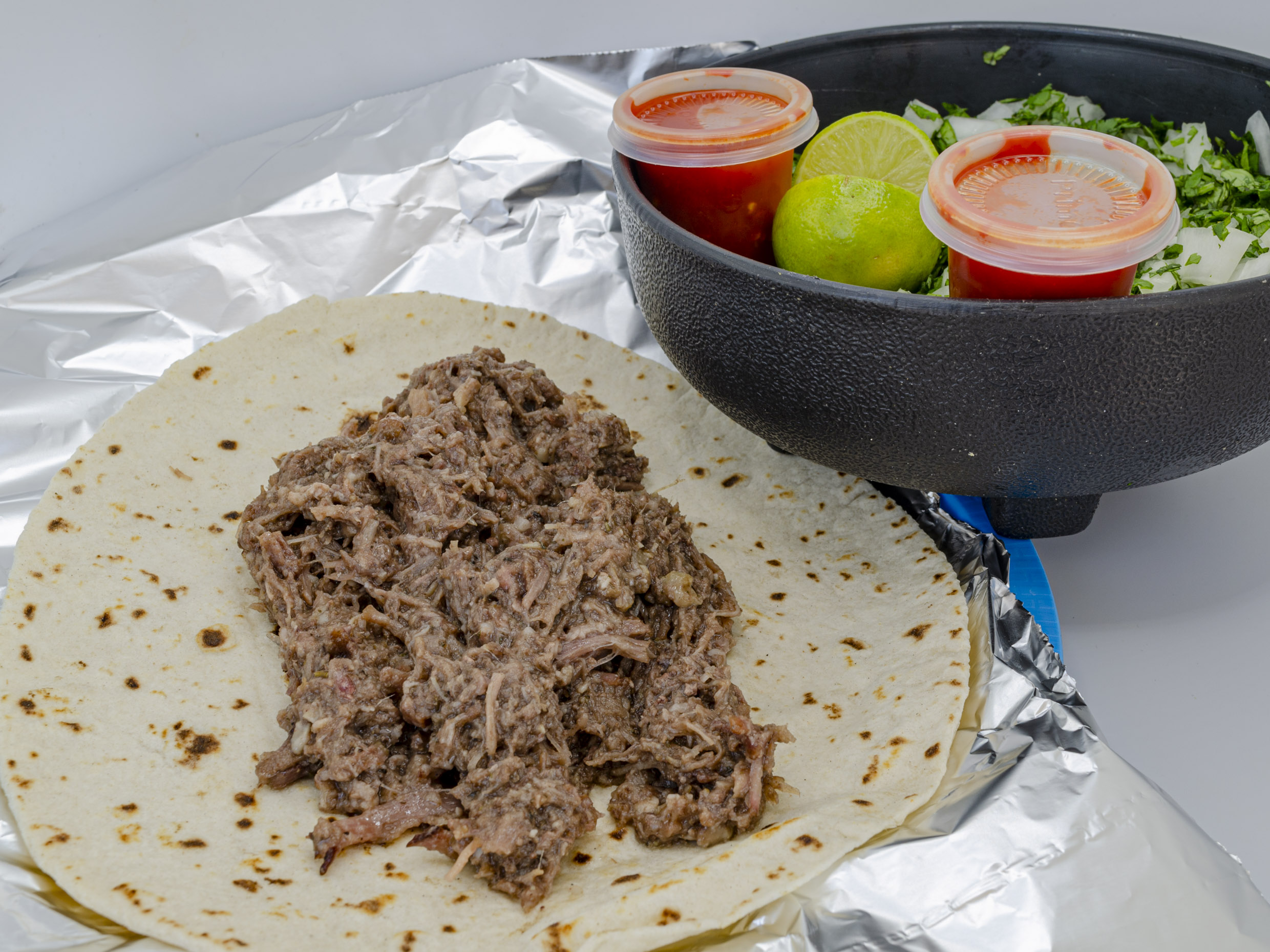4 Tacos de barbacoa, cebolla, cilantro, limón y salsa roja.