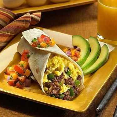 Tortilla harina, huevo revuelto, sirloin con cebolla