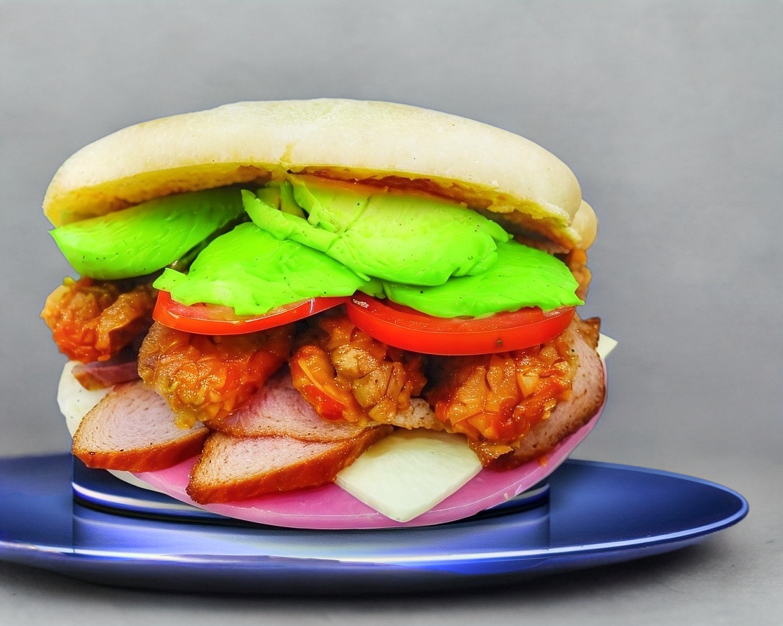 Pechuga de pollo, bañada en salsa, BBQ, queso, aguacate, tomate, chile, mayonesa.