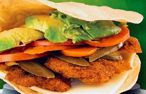 Pechuga de pollo empanizada, queso, aguacate, tomate, chile, mayonesa.