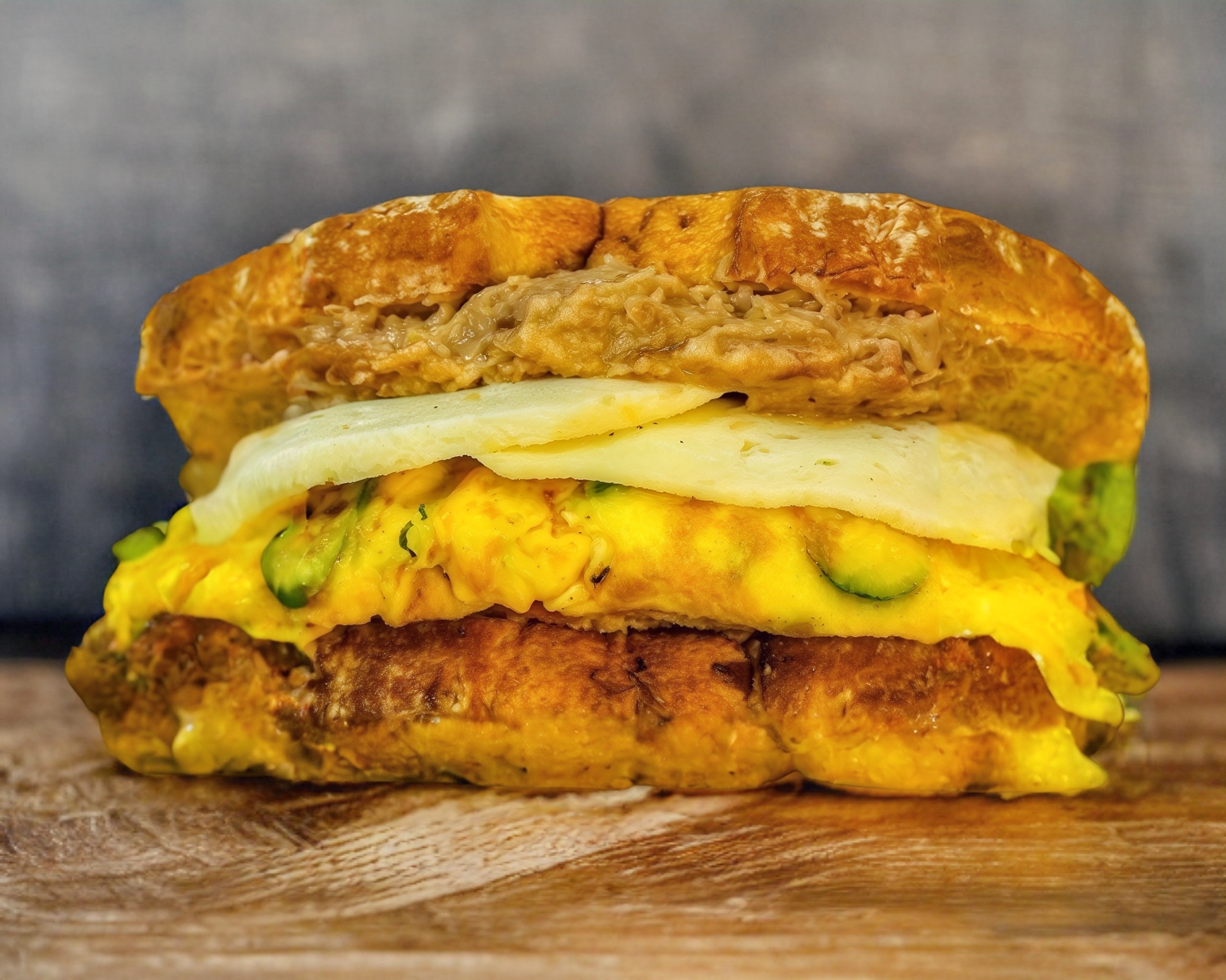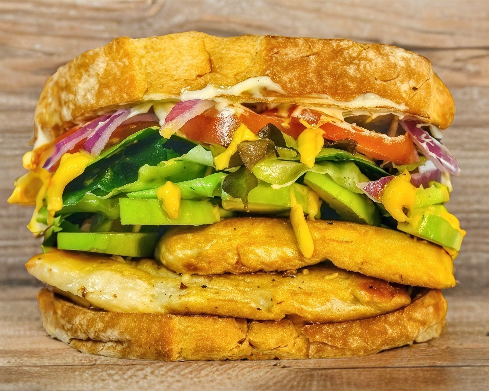 Delicioso CLUB SANDWICH DE 3 PISOS acompañado de pechuga de pollo (200 g), tiras de tocino partidas a la mitad, jamon, queso amarillo, mayonesa, mostaza, lechuga hidropónica, espinaca baby orgánica, tomate y aguacate, como side lleva fruta del día y su chilito toreado, empaquetado en charola térmica.