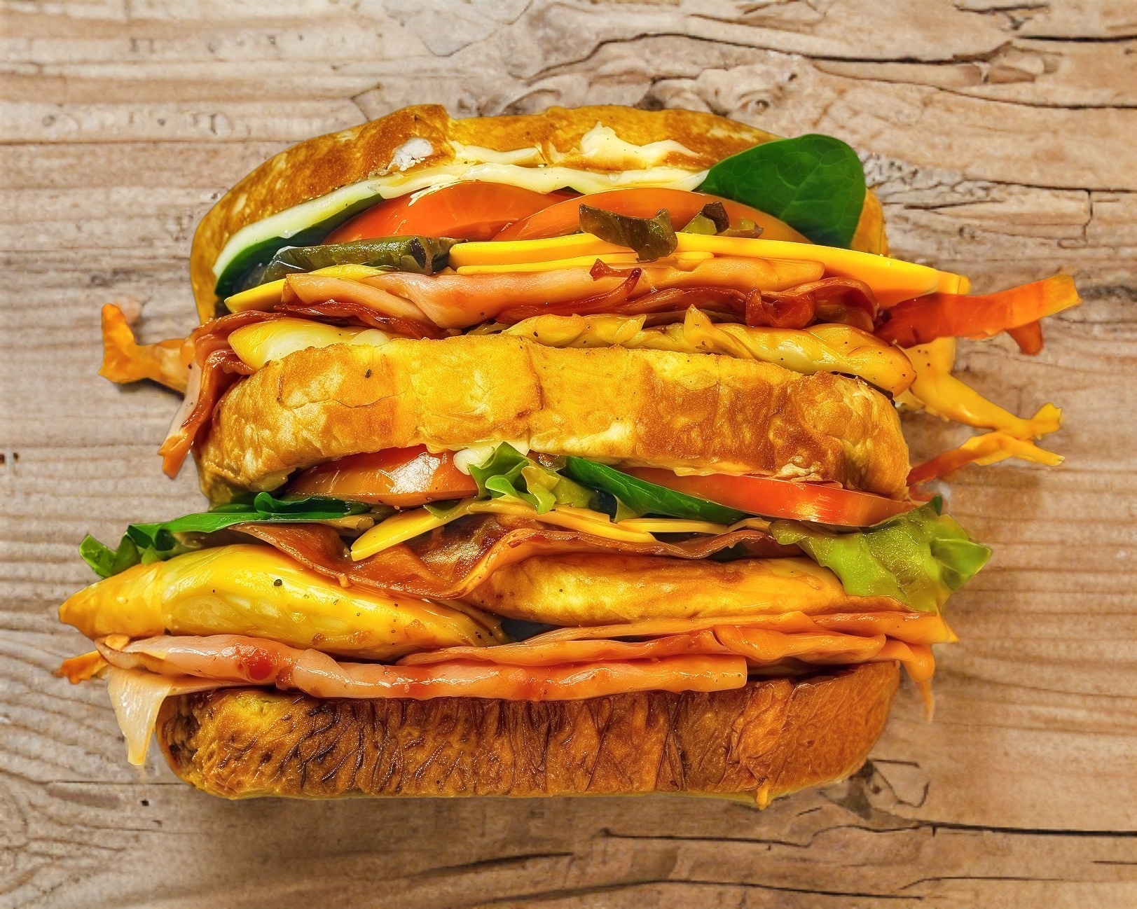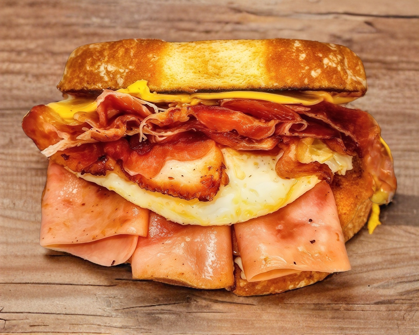 Muy rico SANDWICH AMERICANO acompañado de jamon, queso amarillo, tocino, huevos estrellados u omellete (2 huevos), mayonesa con su chilito toreado y fruta del día como side o sabritas, empaquetado con su charola termica.