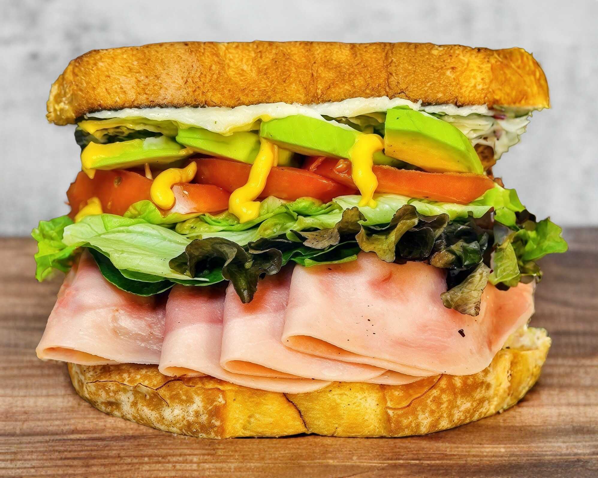 El clásico SANDWICH DE JAMON compuesto de 4 rebanas de jamon, lechuga hidropónica, tomate, cebolla morada, aguacate, espinaca baby orgánica, mayonesa y mostaza, con su side de fruta del día y su picosito chile toreado.