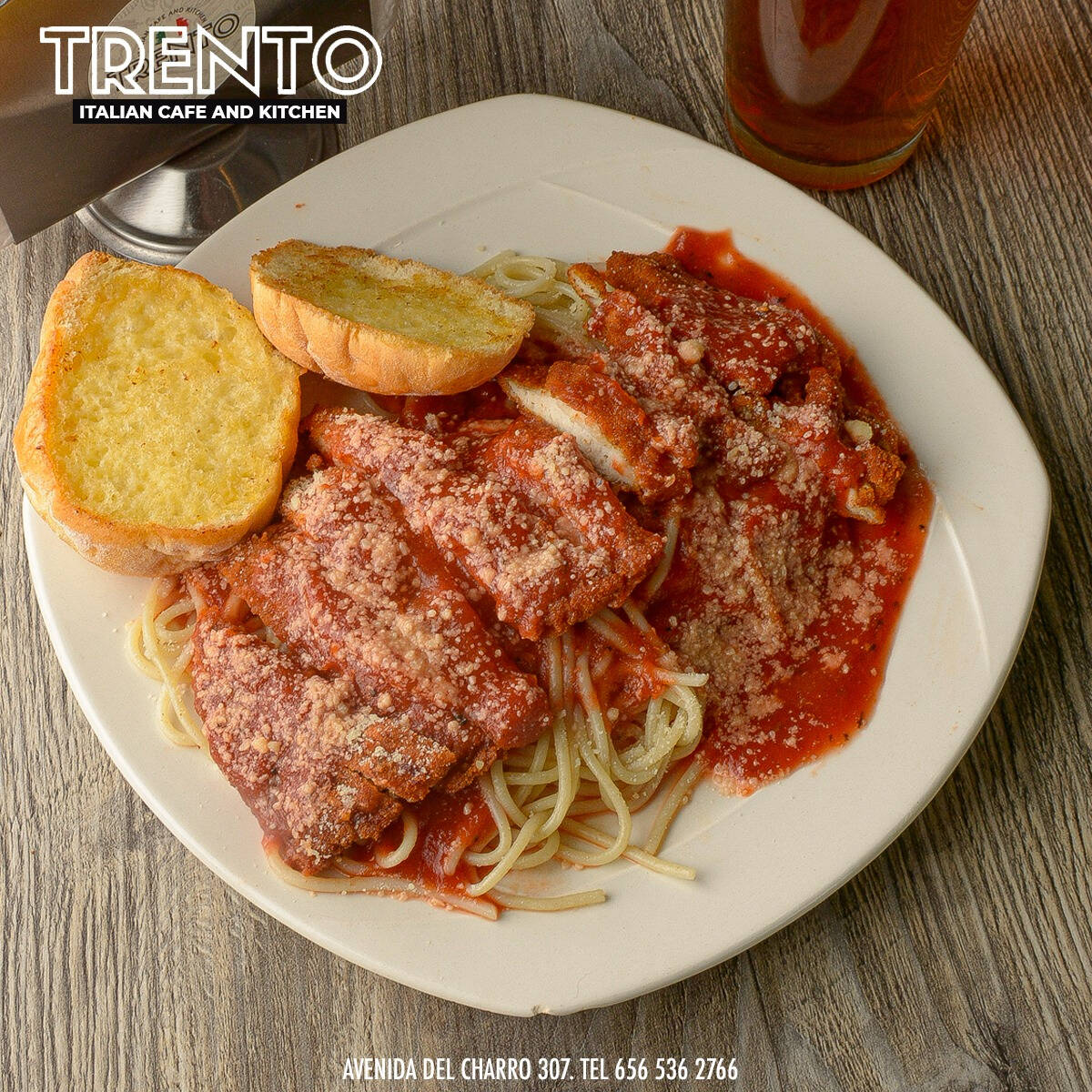 pechuga de pollo empanizada, bañada en salsa marinara, queso mozarella y parmesano en una cama de pasta.