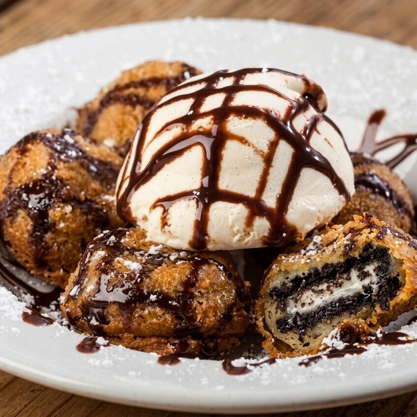 4 OREO capeadas con una bola de nieve de vainilla bañada en jarabe de Chocolate