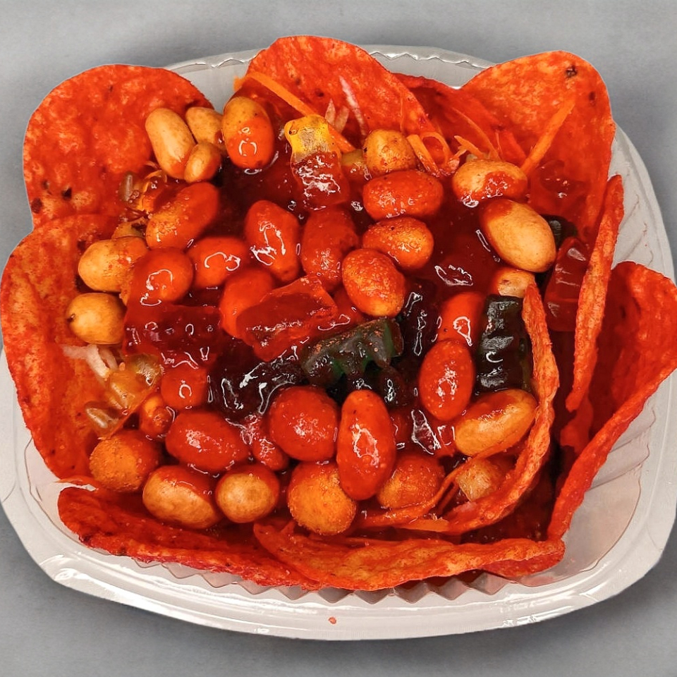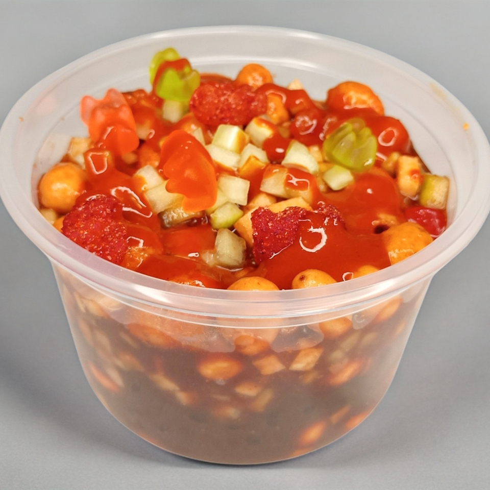1/2L de deliciosa mezcla de cachuates, pepino, jícama, gomitas mixtas, cueritos, salsa negra de la casa, salsa y tico