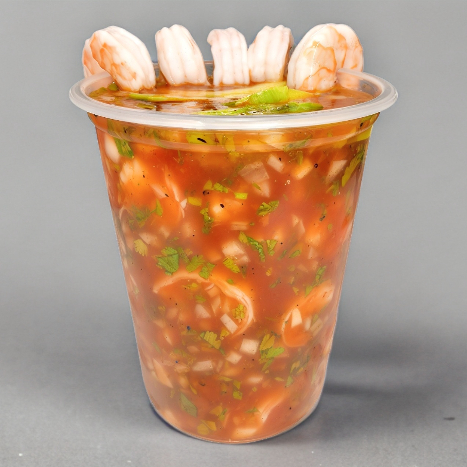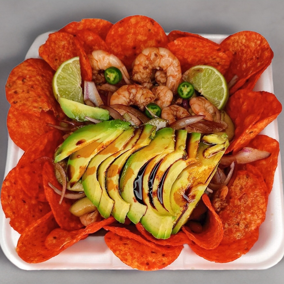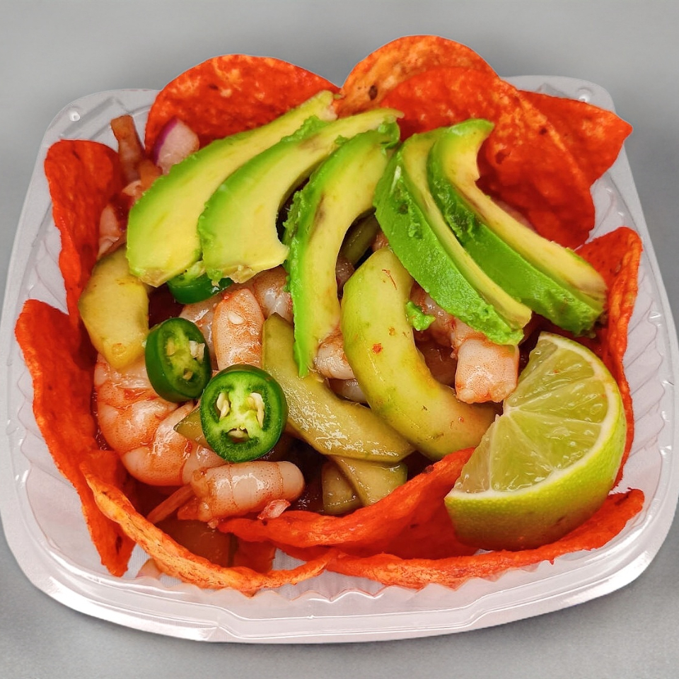 camarón, pepino, aguacate, cebolla morada, chile serrano, salsa marisquera de la casa, valentina, tostito verde o morado