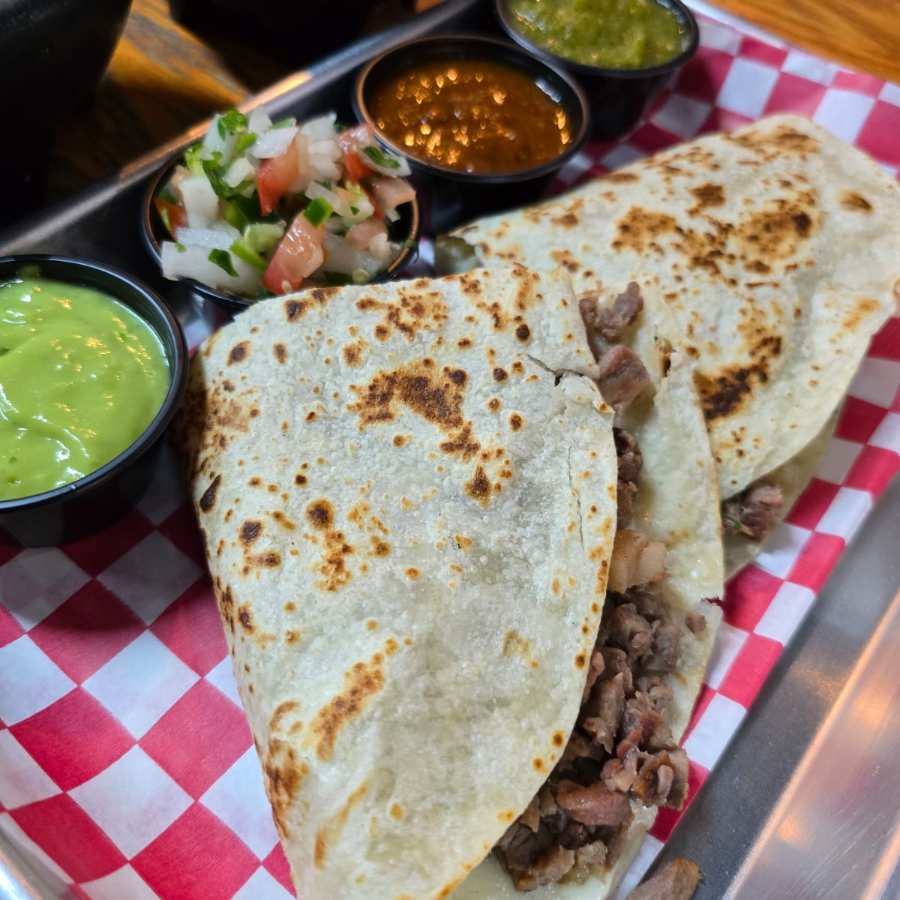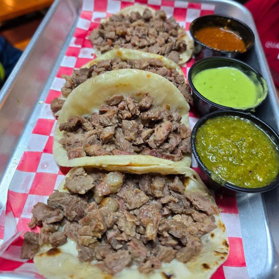 orden de 4 tacos de carne asada,con pico de gallo,salsa roja.salsa verde y guacamole