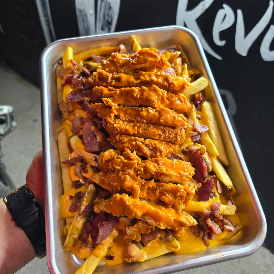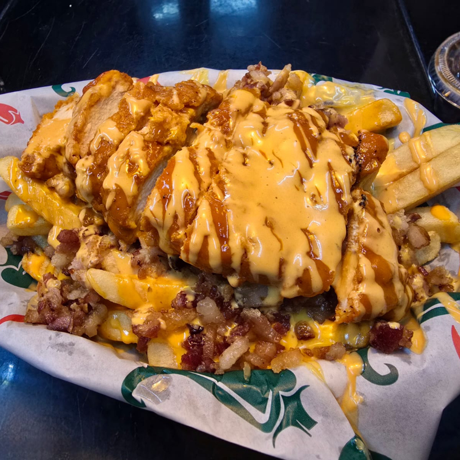 papas fritas bañadas con aderezo bufalo ranch y queso chedar tocino y pechuga empanizada