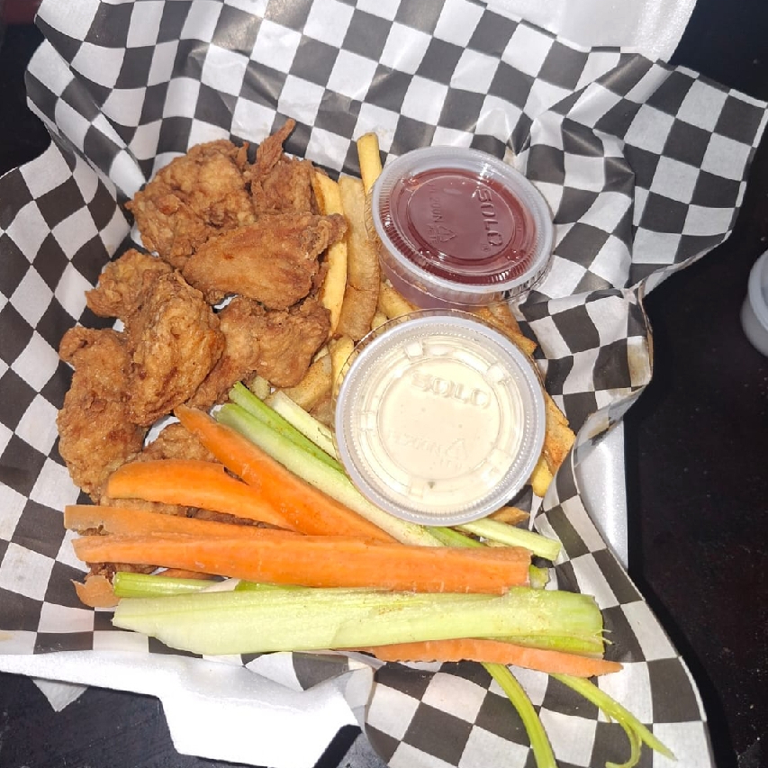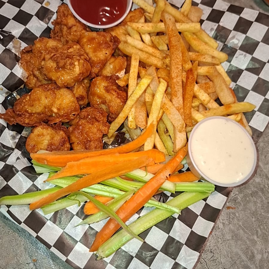 300 gramos de boneless bañados en salsa BBQ + 250 gramos de papas + aderezo y catsup acompañado de zanahoria y apio
