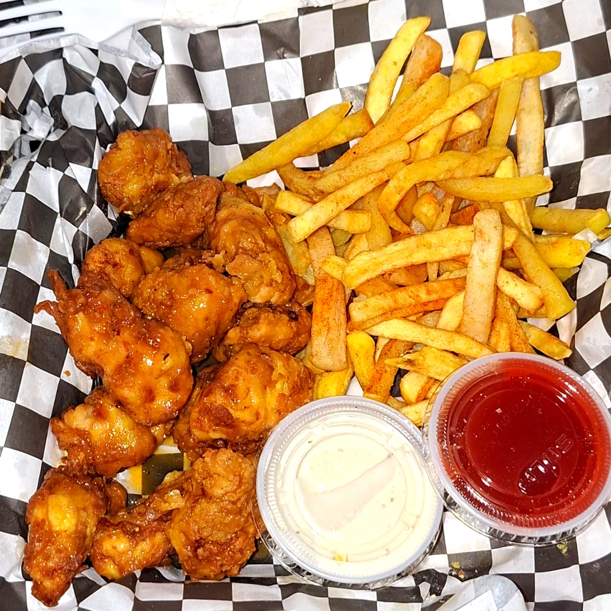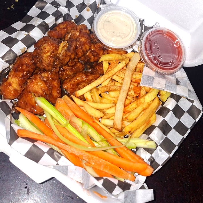 350 gramos de boneless bañados en su salsa + 250 gramos de papa + aderezo y catsup acompañado de zanahoria y apio