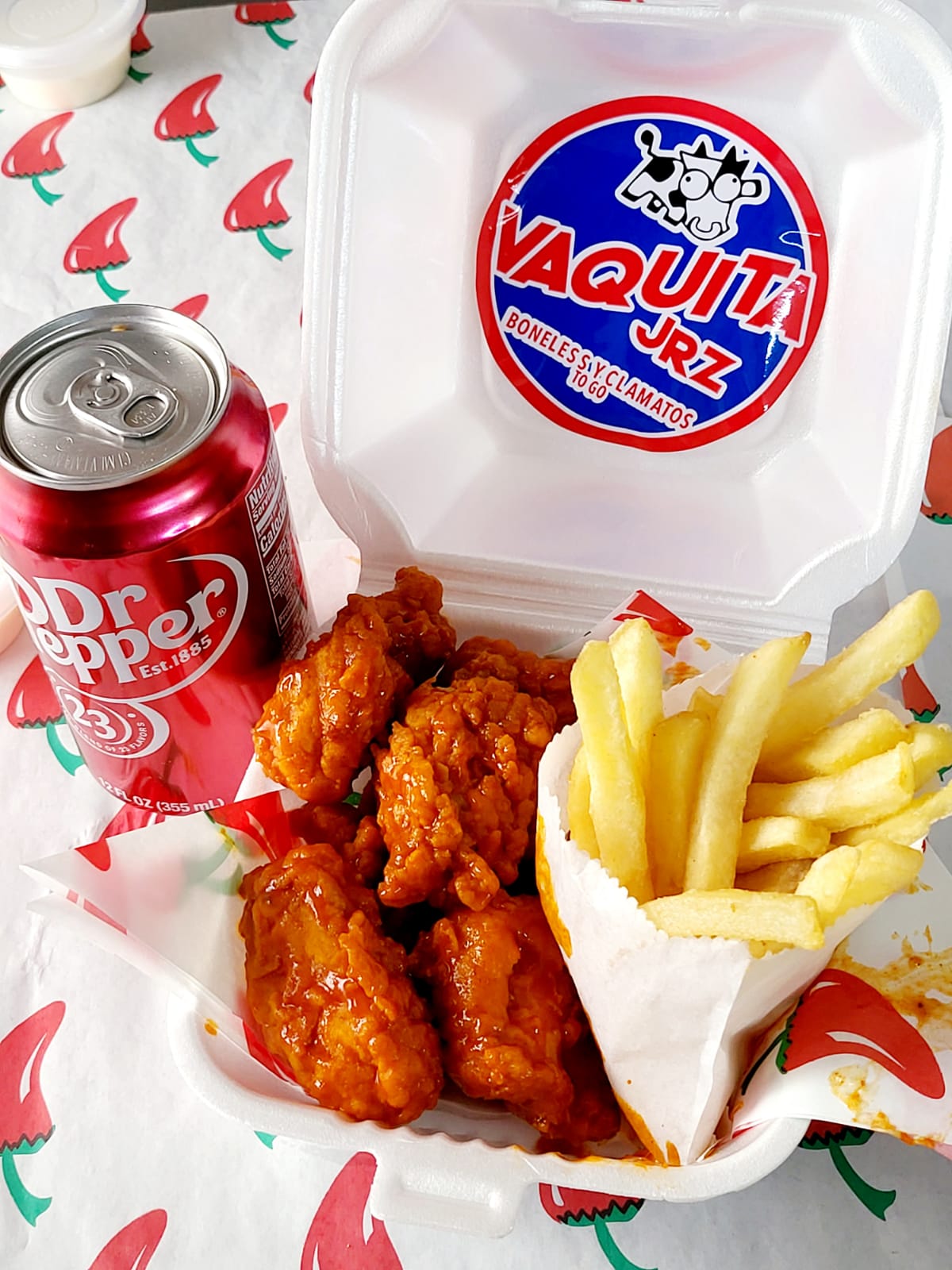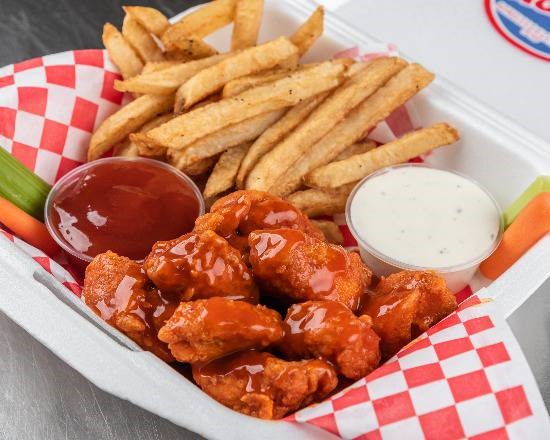 Entre 9 a 11 piezas de boneless bañados en salsa a tu eleccion acompañados con papas fritas aderezos y veguetale