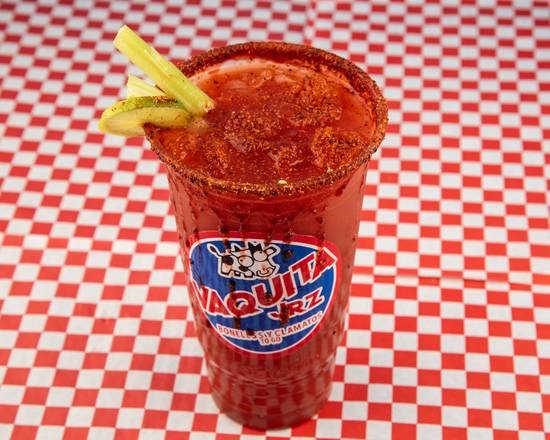 Vaso de 1 litro de clamato preparado con nuestra receta de la casa salsas negras, sal, pimienta, limón, tabasco, valentina, escarchado con chamoy y tajín.