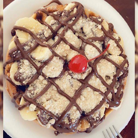 1 Waffle cubierto con plátano, crema de Avellanas, Mazapán y cereza Maraschino.