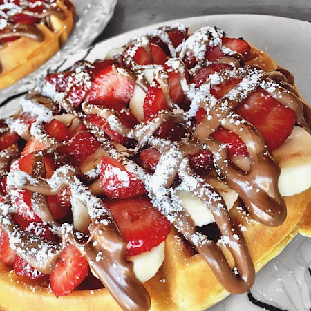 1 Waffle, cubierto con Plátano, Fresas, crema de Avellanas y cubierto con Azúcar glass. Te encantará!!