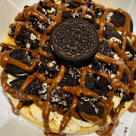 1 Waffle cubierto con plátano, trozos de galletas OREO y crema de Avellanas.