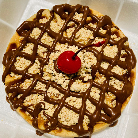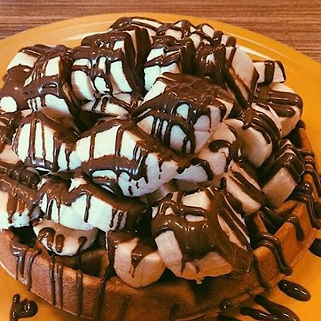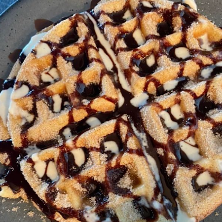 1 Waffle cubierto con azúcar y canela, Lechera y jarabe Chocolate Hershey's.