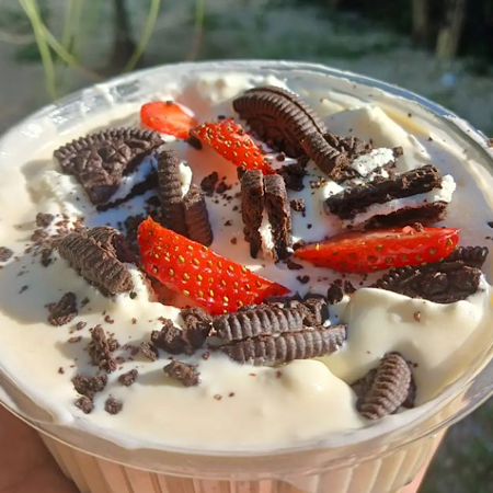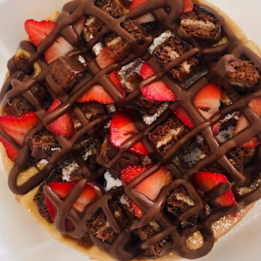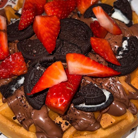 1 Waffle cubierto con crema de Avellanas, trozos de galletas OREO y deliciosas Fresas.