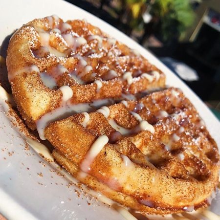 1 Waffle cubierto de azúcar, canela y azúcar glass, opción de Miel Mapple o Lechera.