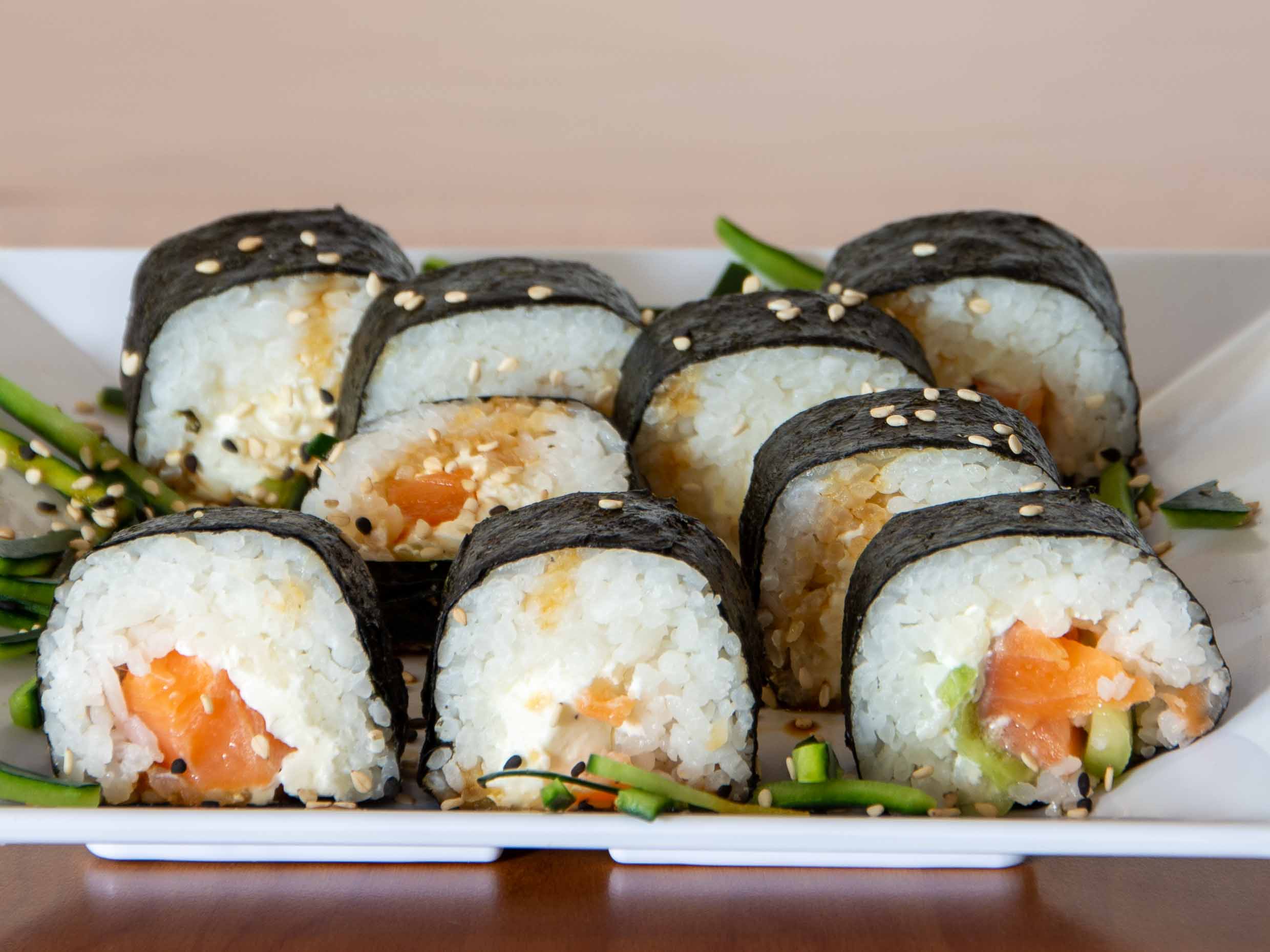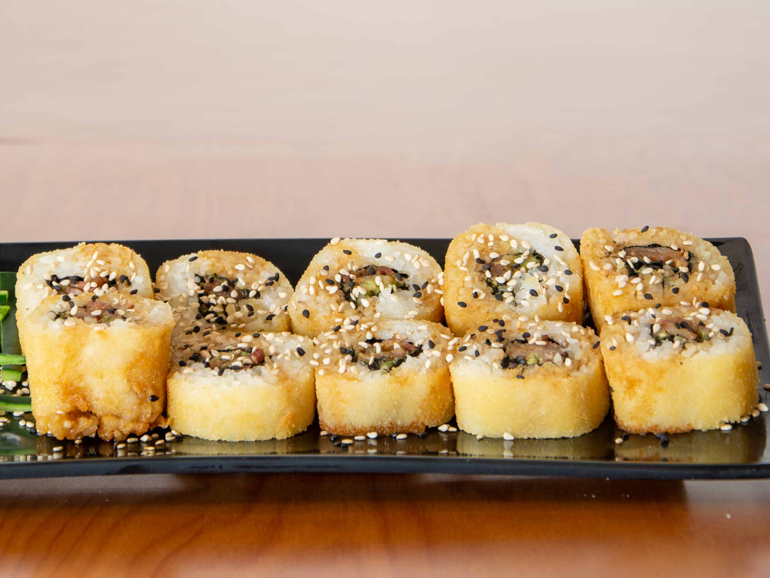 Salmon, queso crema, pepino, cubierto de nori bañado en anguila y ajonjolí.