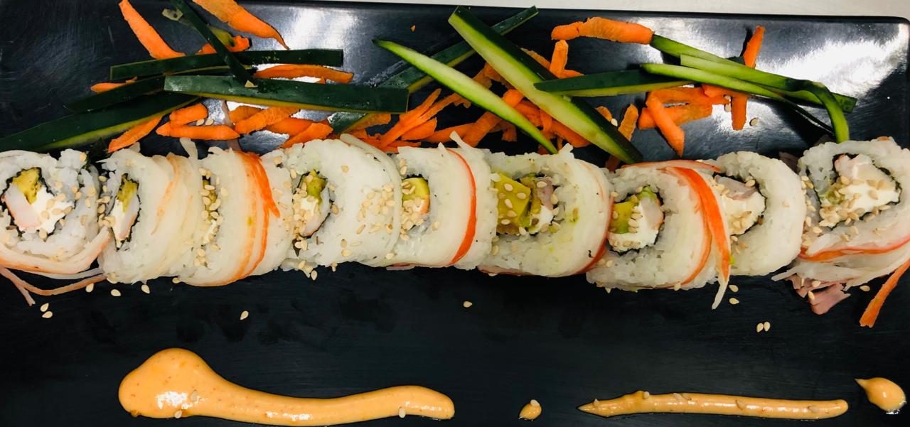 Queso crema, surimi, pepino, cubierto de aguacate, tartara y masago.