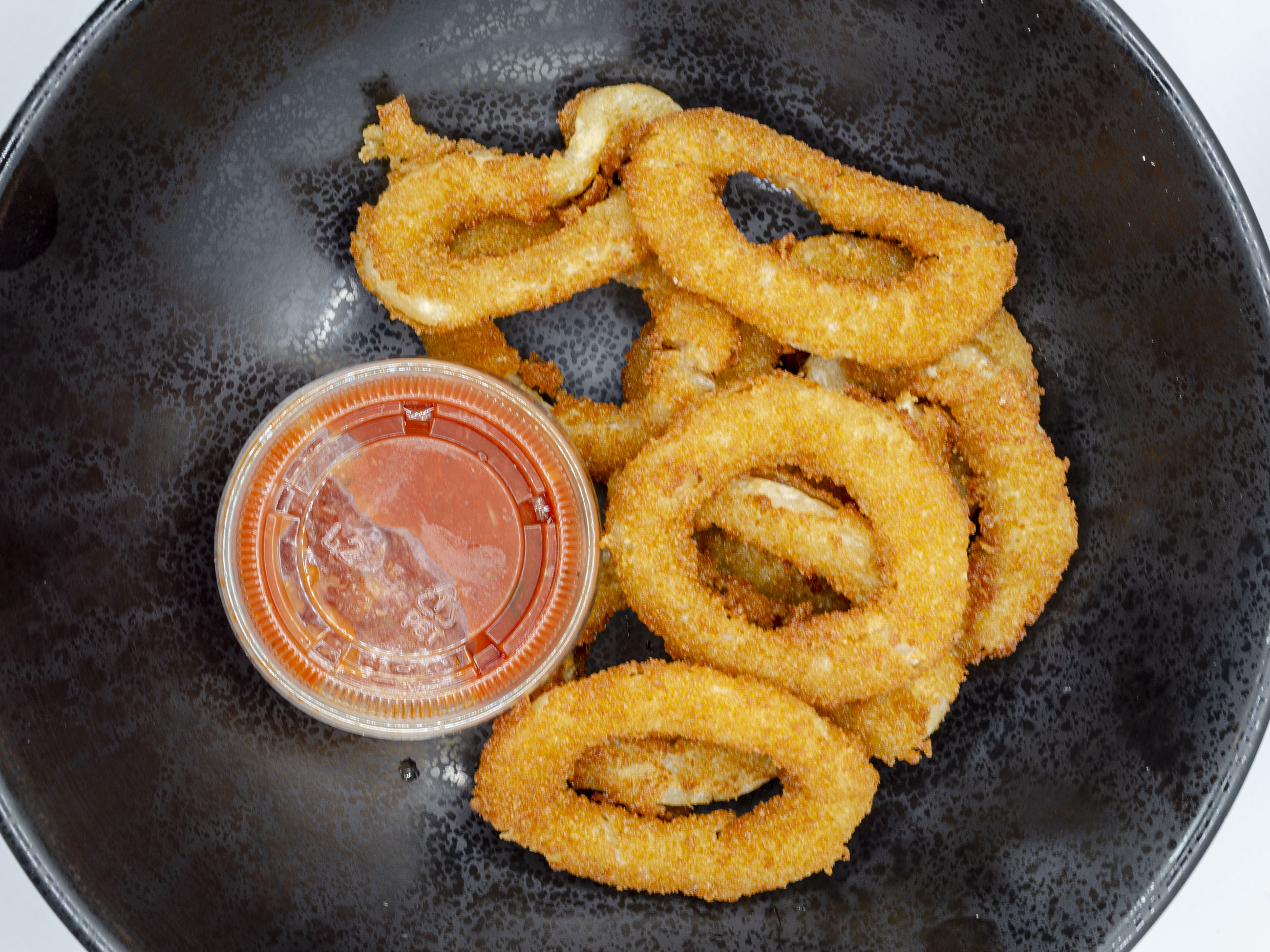 Deliciosa Carne de Res 1/2 Libra, encima 2 aros de cebolla hechos en casa, en pan artesanal, acompañada con papas fritas