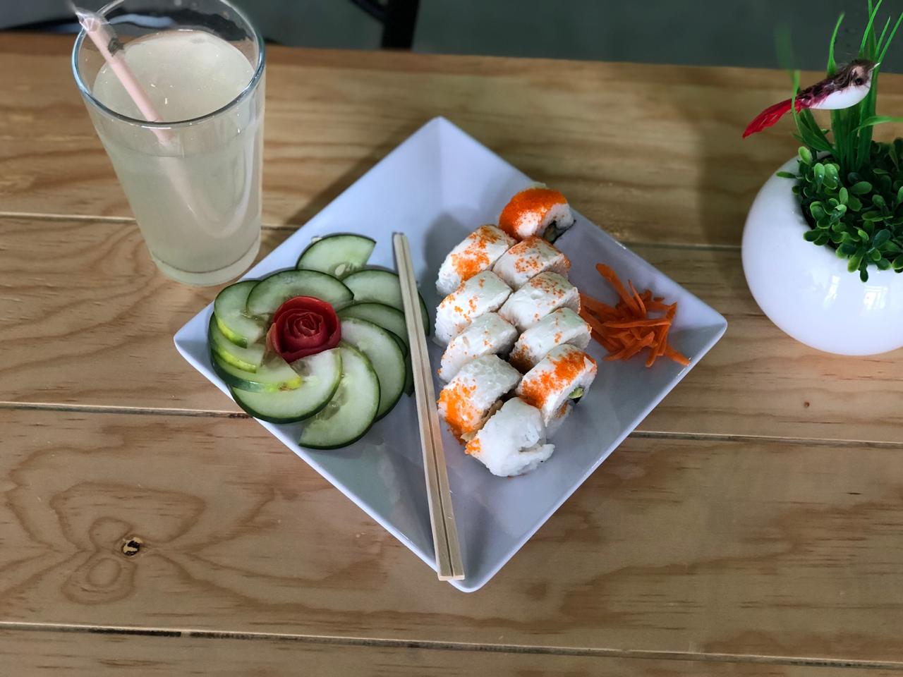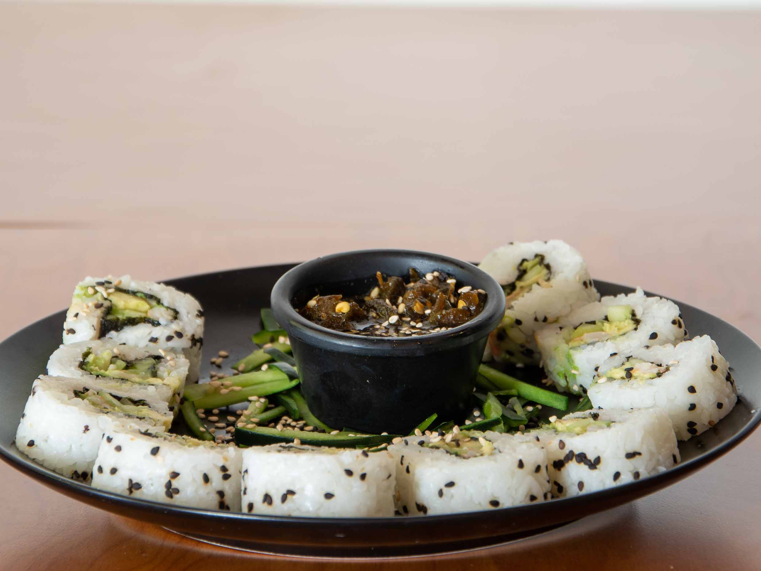 Camarón, pepino, aguacate cubierto de ajonjolí.