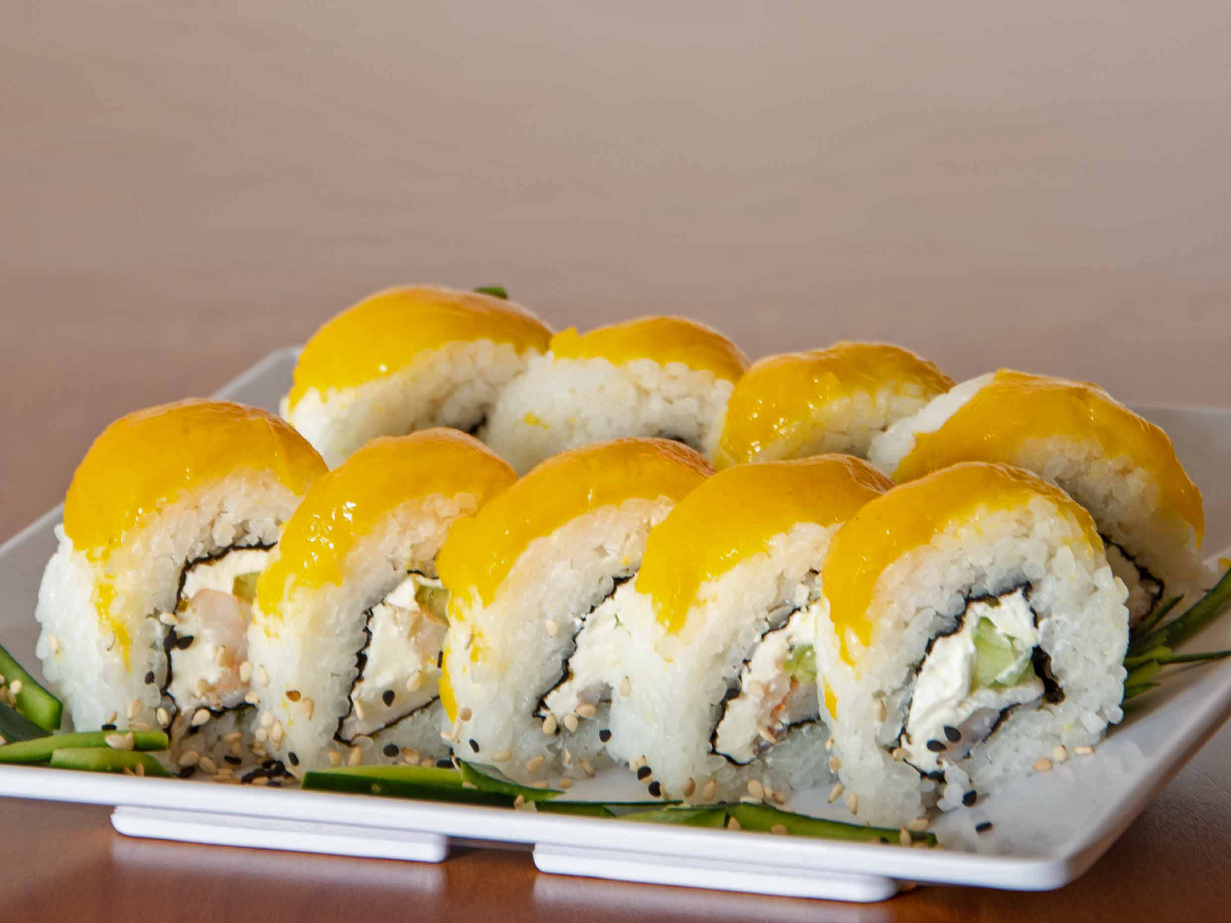 Camarón, aguacate, pepino, cubierto de queso crema y masago.